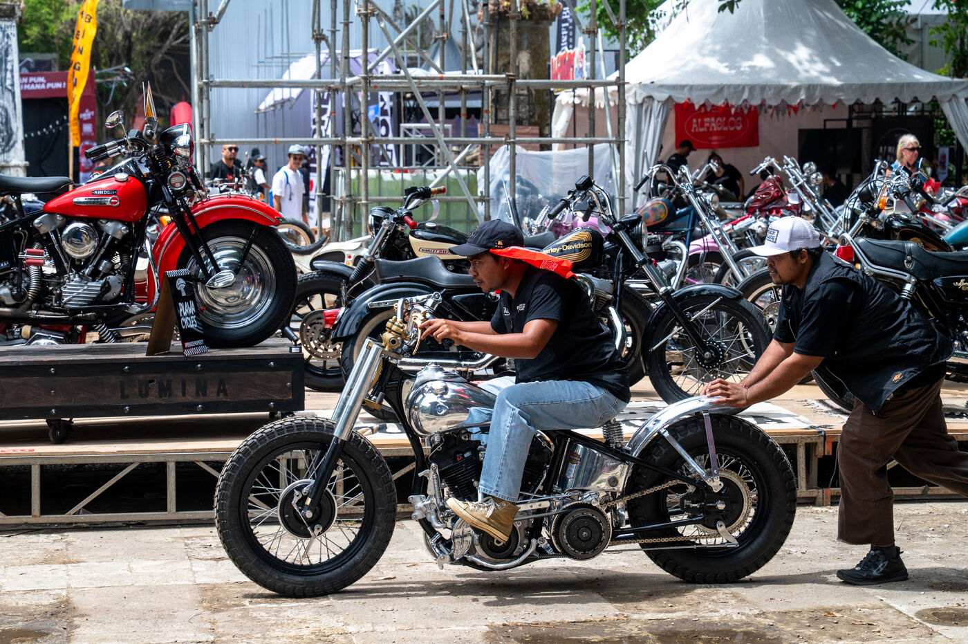 Au fil des années, l’événement a attiré des builders venus du Japon, d’Australie, d’Europe et mais avat tout Indonésien, où la custome culture est particulièrement vivace. Les visiteurs ne découvrent pas seulement des engins incroyables, mais participent aussi à une multitude de concerts éparpillés et en action permanente, et passent de shop en shop incarnés par les plus grands (Yamaha,Honda, Mooneyes, Kustomfest) jusqu’aux petits préparateurs plus intimistes, mais ultra créatifs comme Kedux Garage, Thrive Motorcycle et tant d’autres.