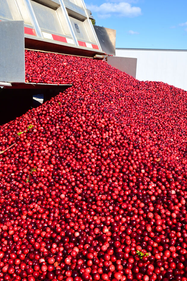 La canneberge pousse dans les tourbières et les marais. Les fruits sont mûrs et prêts à pour la récolte à partir de septembre-octobre. Pour collecter les baies arrivées à maturité, les champs de canneberges sont inondés la veille de la récolte. Au fil des heures, certaines baies se détachent de leurs plants. Celles qui s’y accrochent encore sont décrochées à l’aide de batteuses nommées dévidoirs. Une fois séparées des arbustes, les baies se mettent à flotter à la surface de l’eau. Il n’y a plus qu’à tirer un filet spécial pour les rassembler et les ramener sur la rive afin de les collecter et de les acheminer vers leurs lieux d’exploitation.