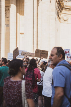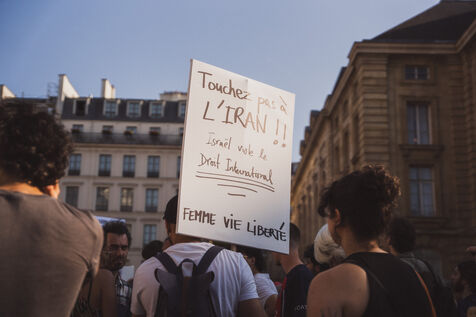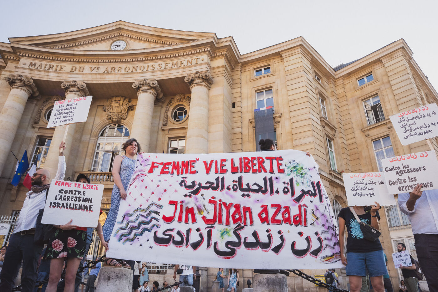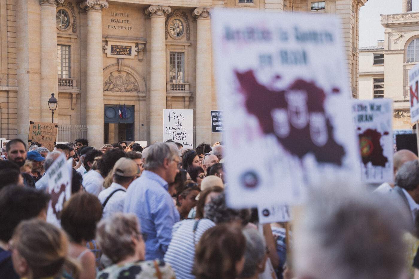 Rassemblement de solidarité avec les populations civiles au proche et au moyen orient victimes des guerres illégales liées aux conflits en cours en Iran et en Israël, Place du Panthéon, à Paris en France le 19 juin 2025.