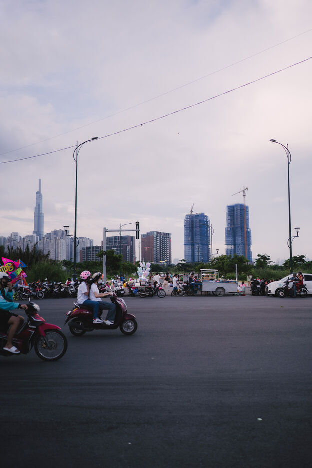 My last days in Ho Chi Minh City. On the way back in a taxi, after yet another intense day of exploration under the heavy Vietnamese heat. My gaze, lost through the window, seeks a moment of peace but keeps thinking about the time I have left in this urban jungle. In the final glow of the setting sun, a kite appears in the sky—triumphant—on the other side of the Sông Sài Gòn river. Then a second, followed by a third, until a small tribe forms—each one different in color, size, and shape.
