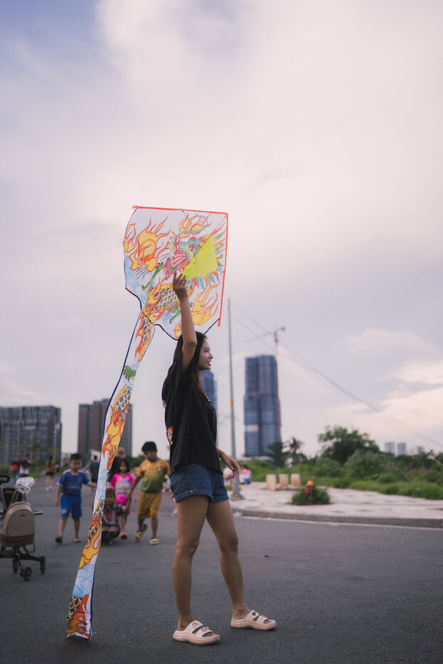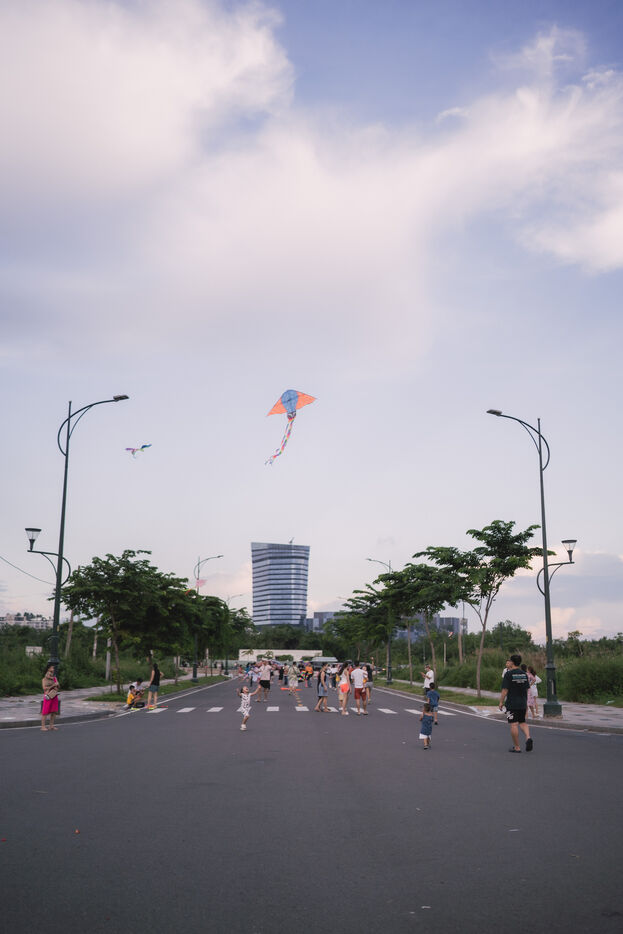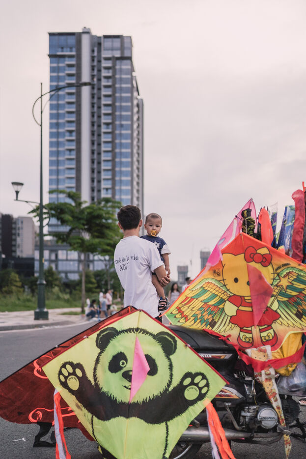 This neighborhood, like Vietnamese society itself, is undergoing rapid transformation. Open spaces stretch out—between empty lots, early-stage construction sites, and dried rice fields. On the edge of a fast-changing, ever-shifting city, the kite becomes a symbol of simplicity—one with the power to slow down, even freeze time, suspended between sky and earth.