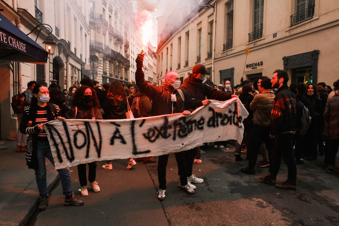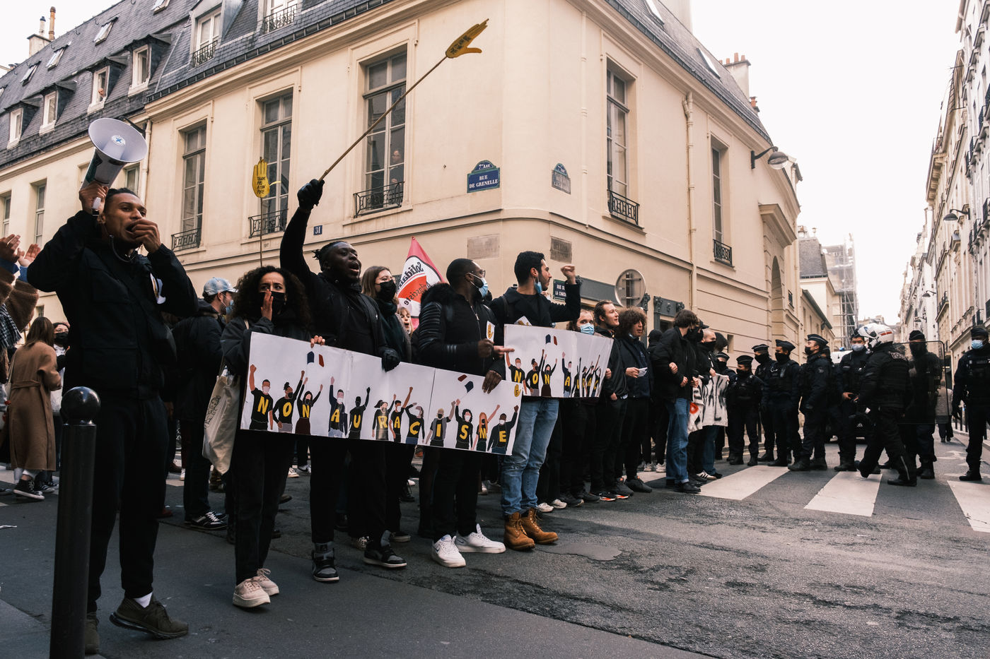 Anti-fascist mobilization of students and anti-racist activists against the arrival of the polemicist and far-right politician Jean Messiha for a conference at the university Sciences Po Paris.