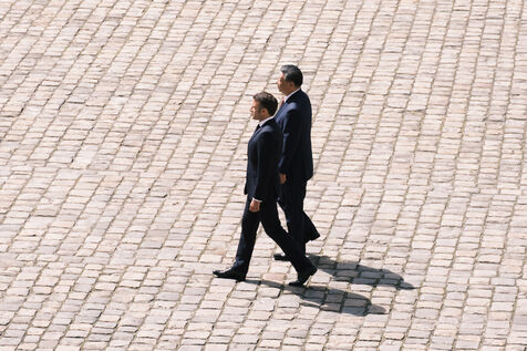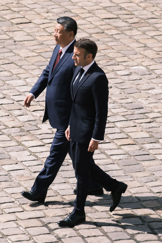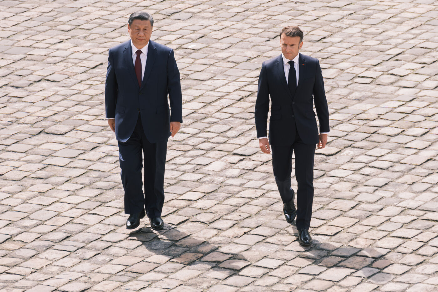 Le Président Emmanuel Macron reçoit le Président de la République populaire de Chine Xi Jinping pour sa visite officielle en France, lors d'une cérémonie d'accueil dans la cour de l'Hôtel national des Invalides.