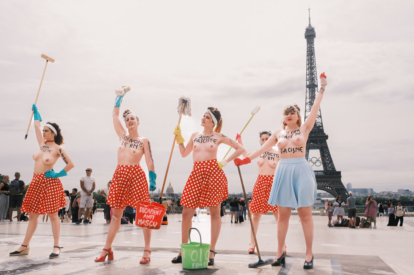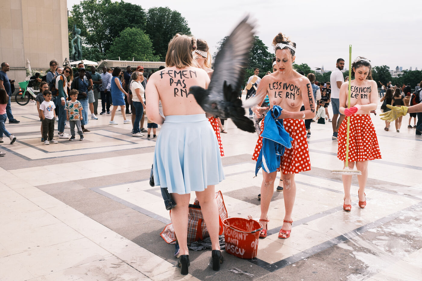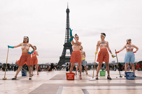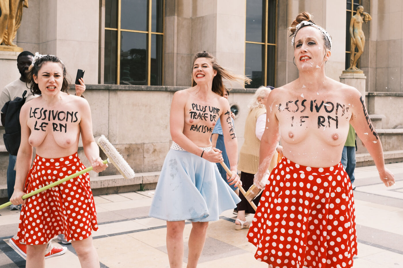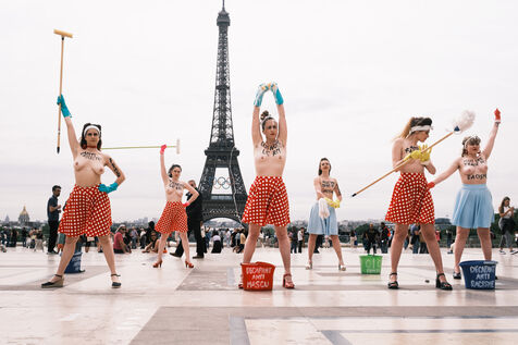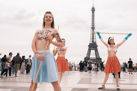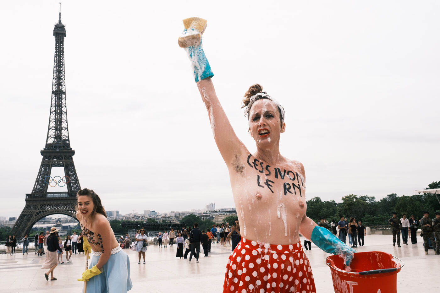 Action du collectif féministe Femen, pour appeler à faire barage à l'extrême droite, à la veille des élections législatives. Sur le parvis des Droits de l'Homme, les militantes mettent en scène un "nettoyage antifasciste contre le RN".
