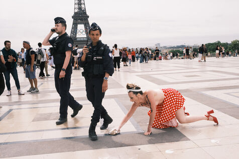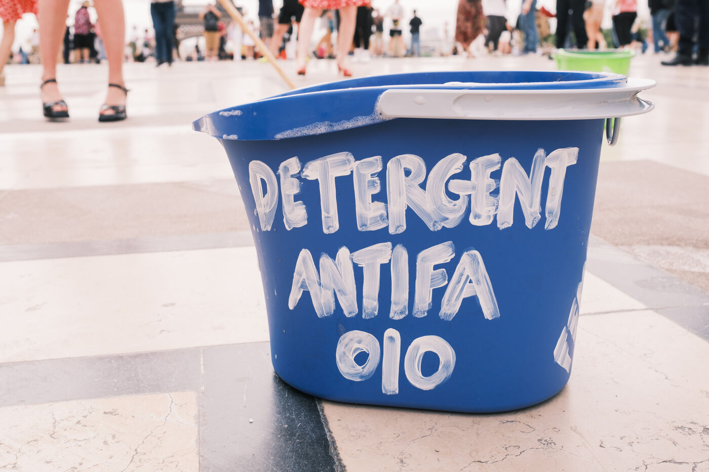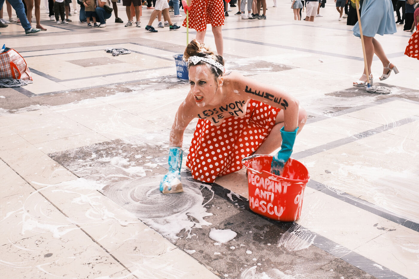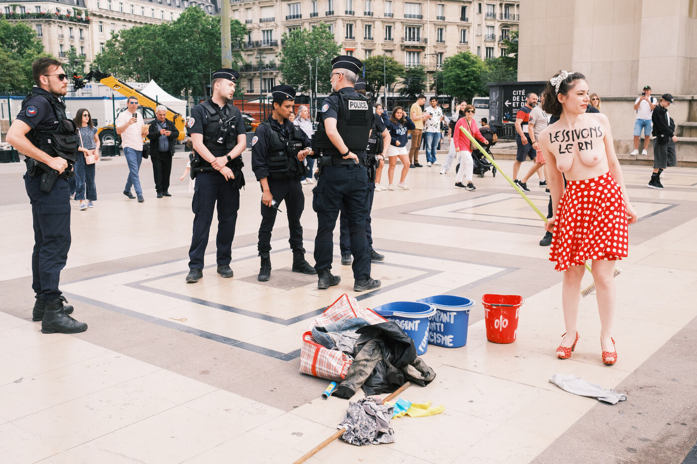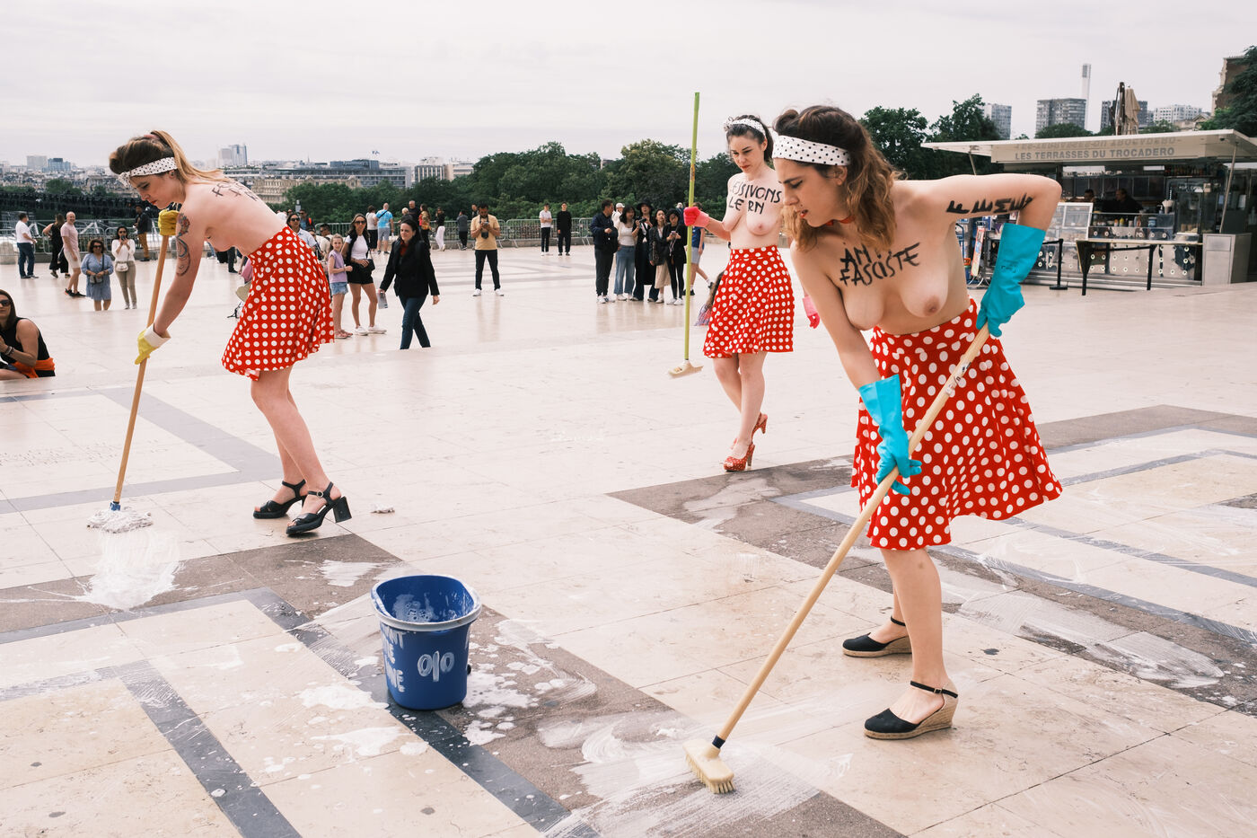 Action du collectif féministe Femen, pour appeler à faire barage à l'extrême droite, à la veille des élections législatives. Sur le parvis des Droits de l'Homme, les militantes mettent en scène un "nettoyage antifasciste contre le RN".
