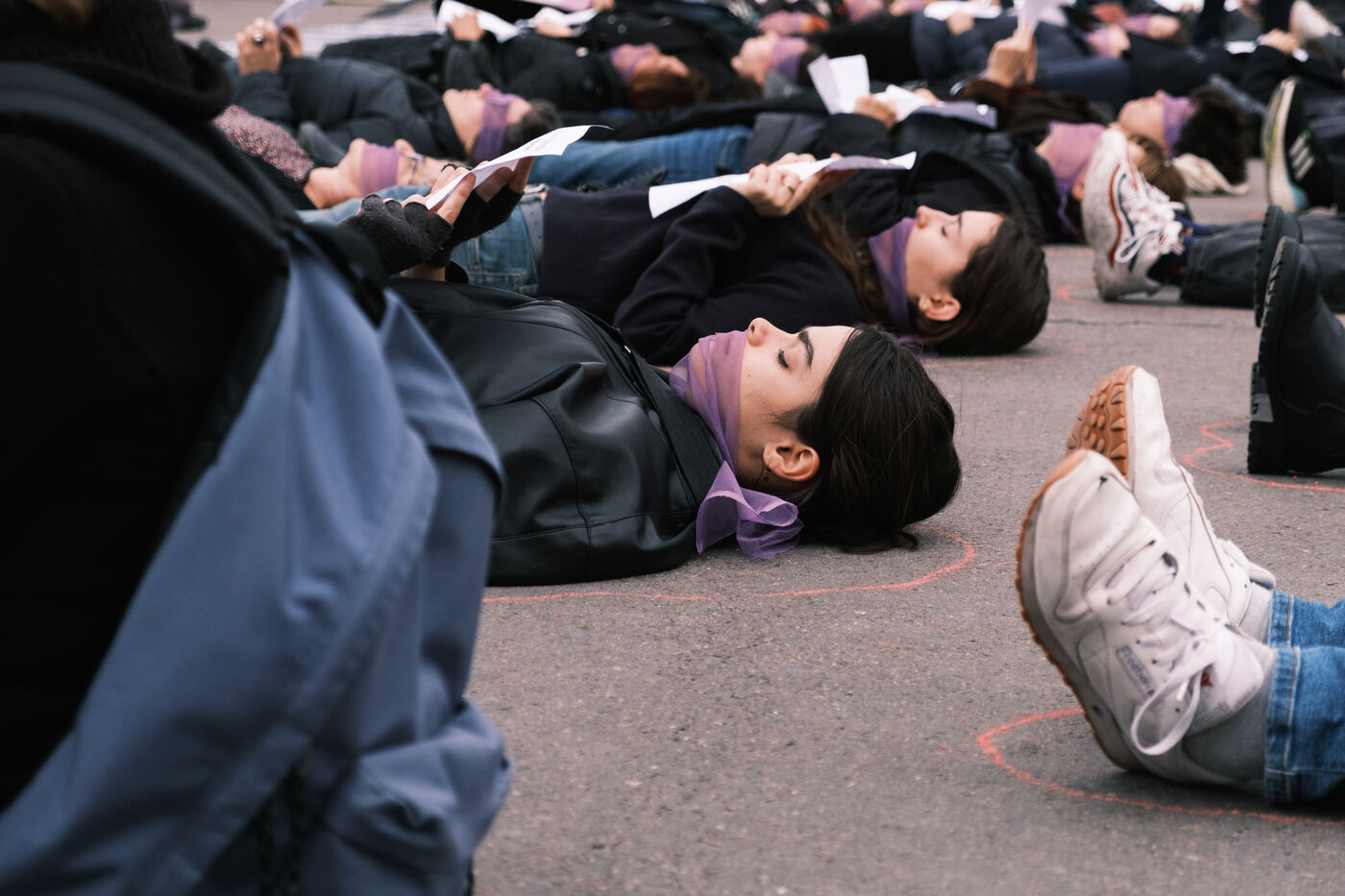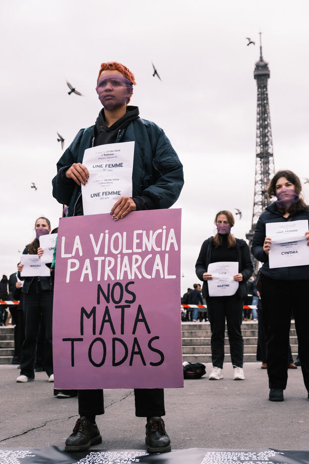 Action du collectif féministe "Nous Toutes" en dénonciation des 1000 victimes de féminicide depuis la présidence Macron, contre l'impunité des hommes violents et en hommage aux victimes.