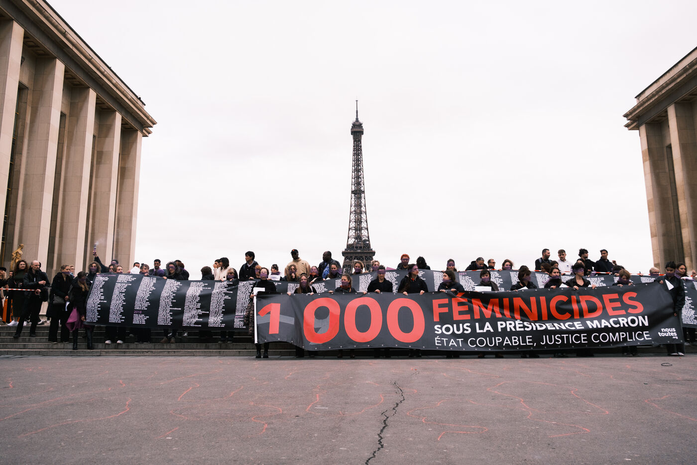 Action by the feminist collective “Nous Toutes” in denunciation of the 1,000 victims of feminicide since the Macron presidency, against the impunity of violent men and in tribute to the victims.
