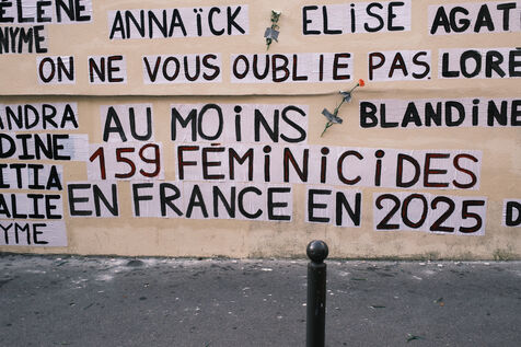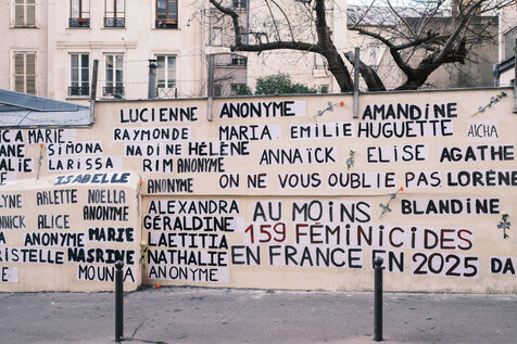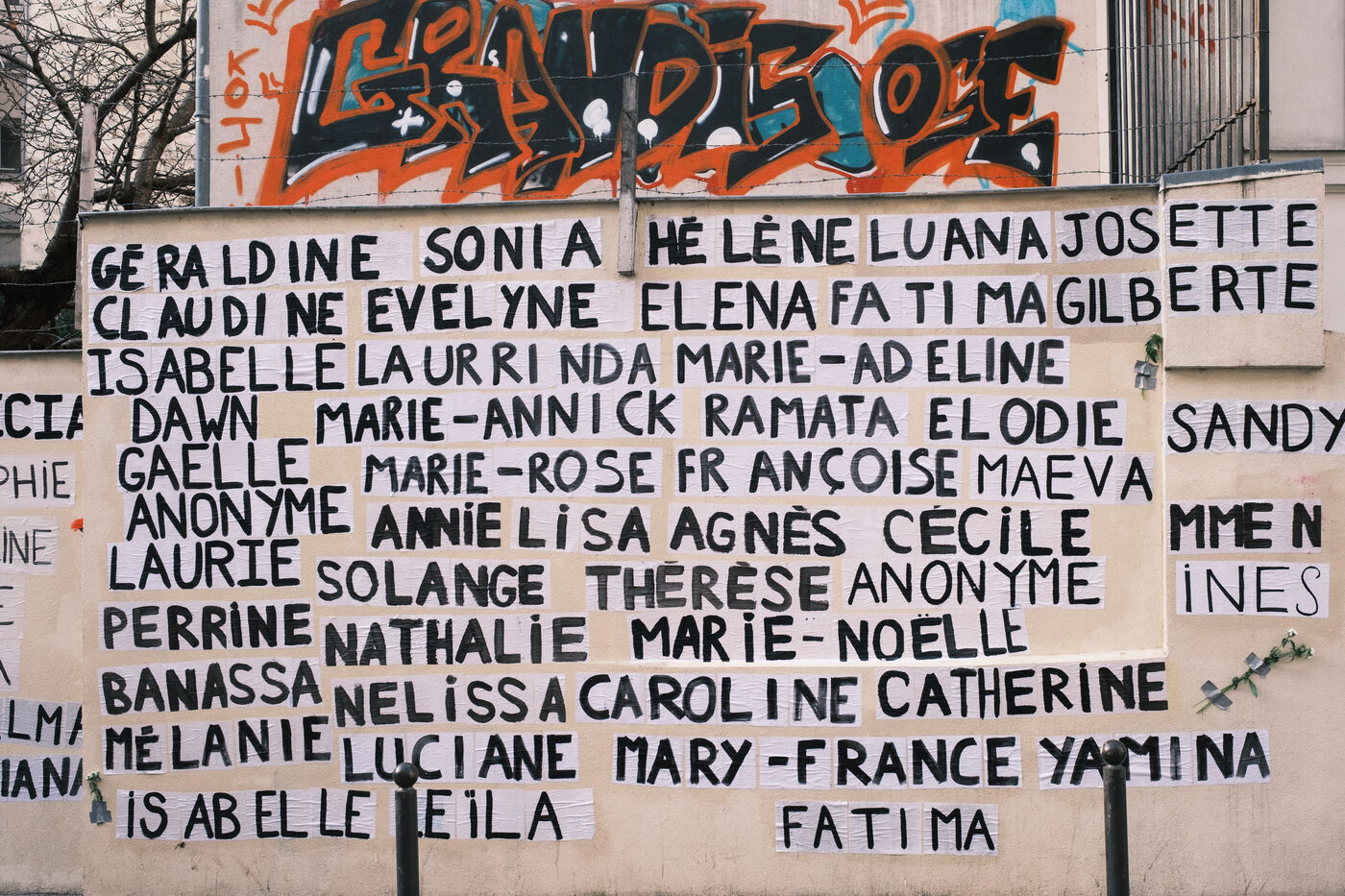 Several activists from the feminist collective Collages Féminicides Paris pasted the names of the 159 (known) victims of femicide in 2025 on a wall in the 19th arrondissement.