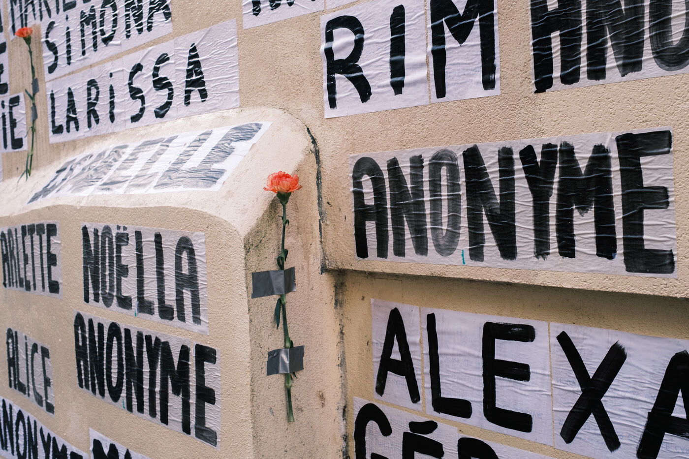 Plusieurs activistes du collectif féministe Collages Féminicides Paris ont collé les noms des 159 victimes (connues) de féminicide en 2025 sur un mur du 19ème arrondissement.