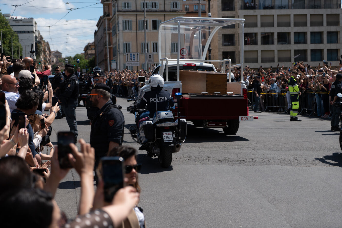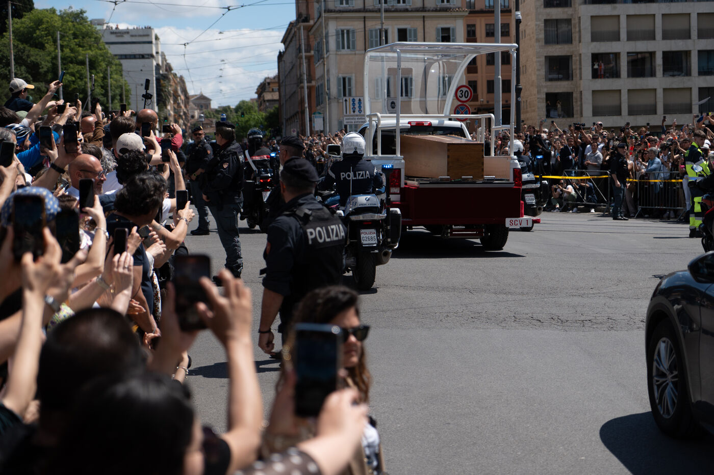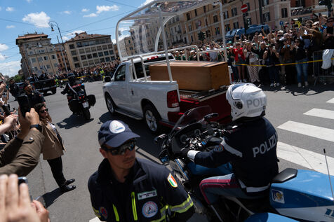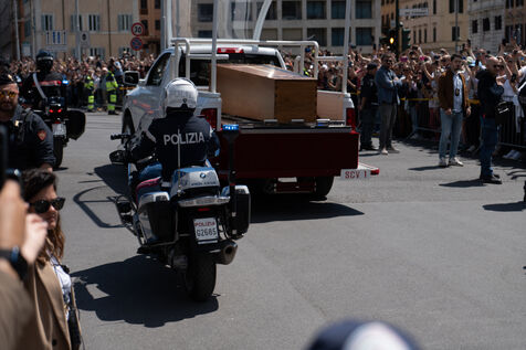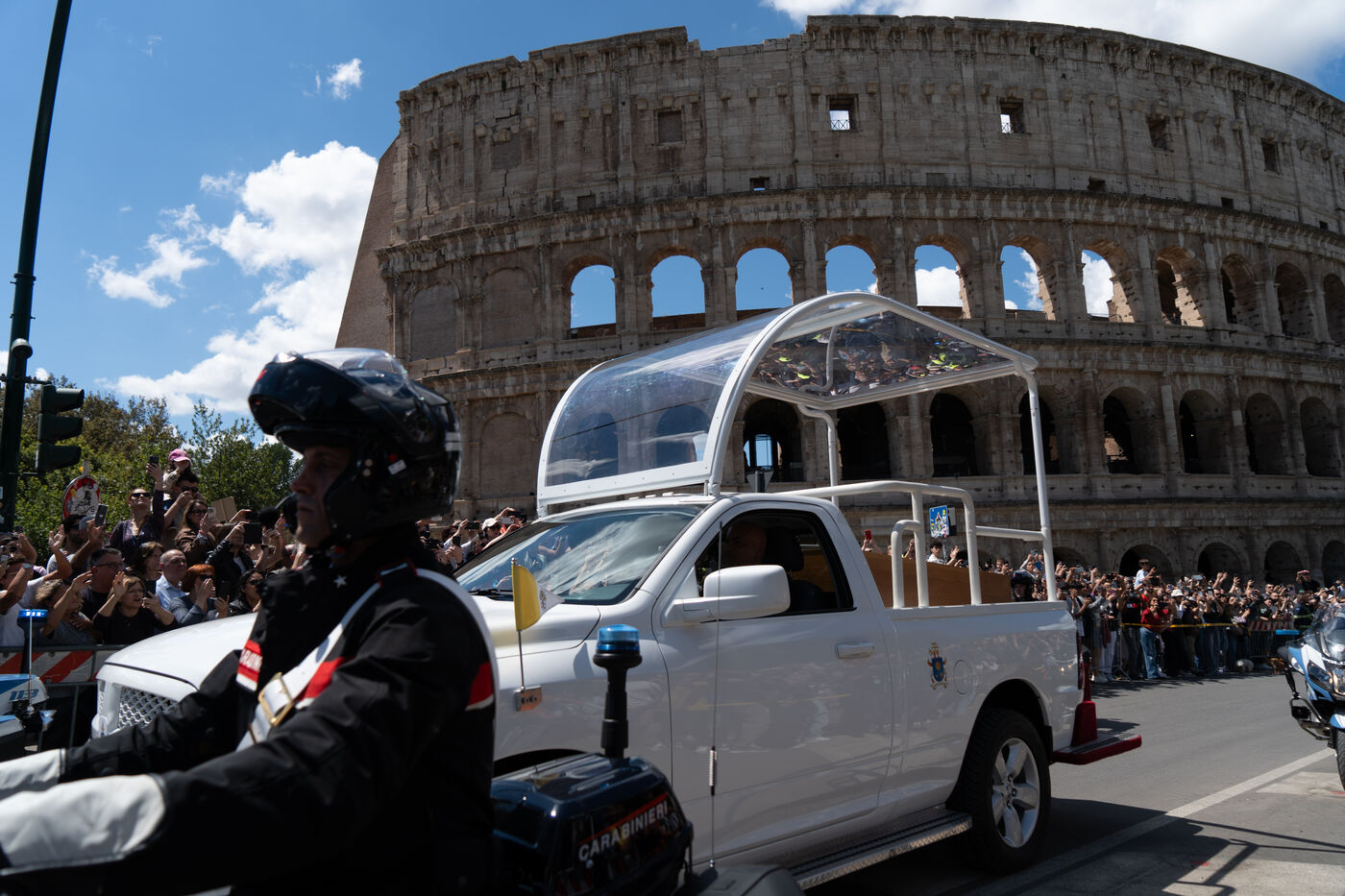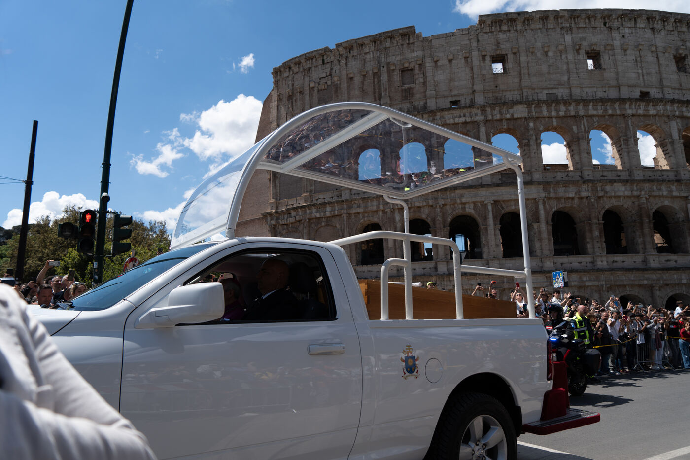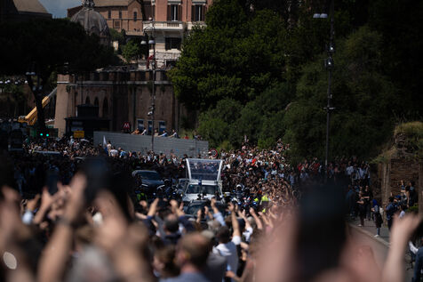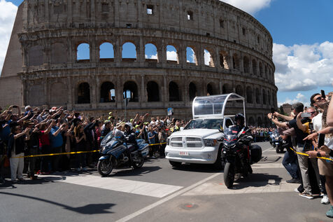 The papamoblie with the coffin of Pope Francis passes in front of the Coliseum. Hundreds of faithful and tourists bid him a final farewell.