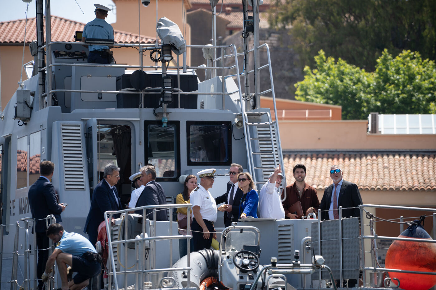 Visite à Villefranche-Sur-Mer de la Ministre de la transition écologique Agnes Pannier Runacher. Expositions du dispositif de sécurité et des installations maritimes.
