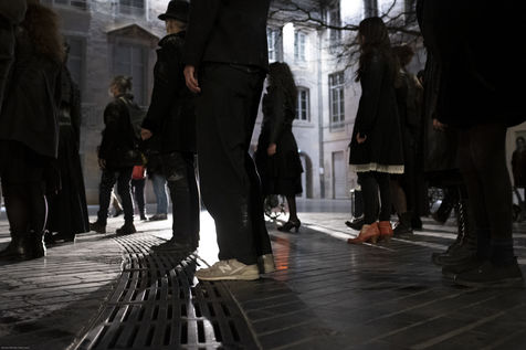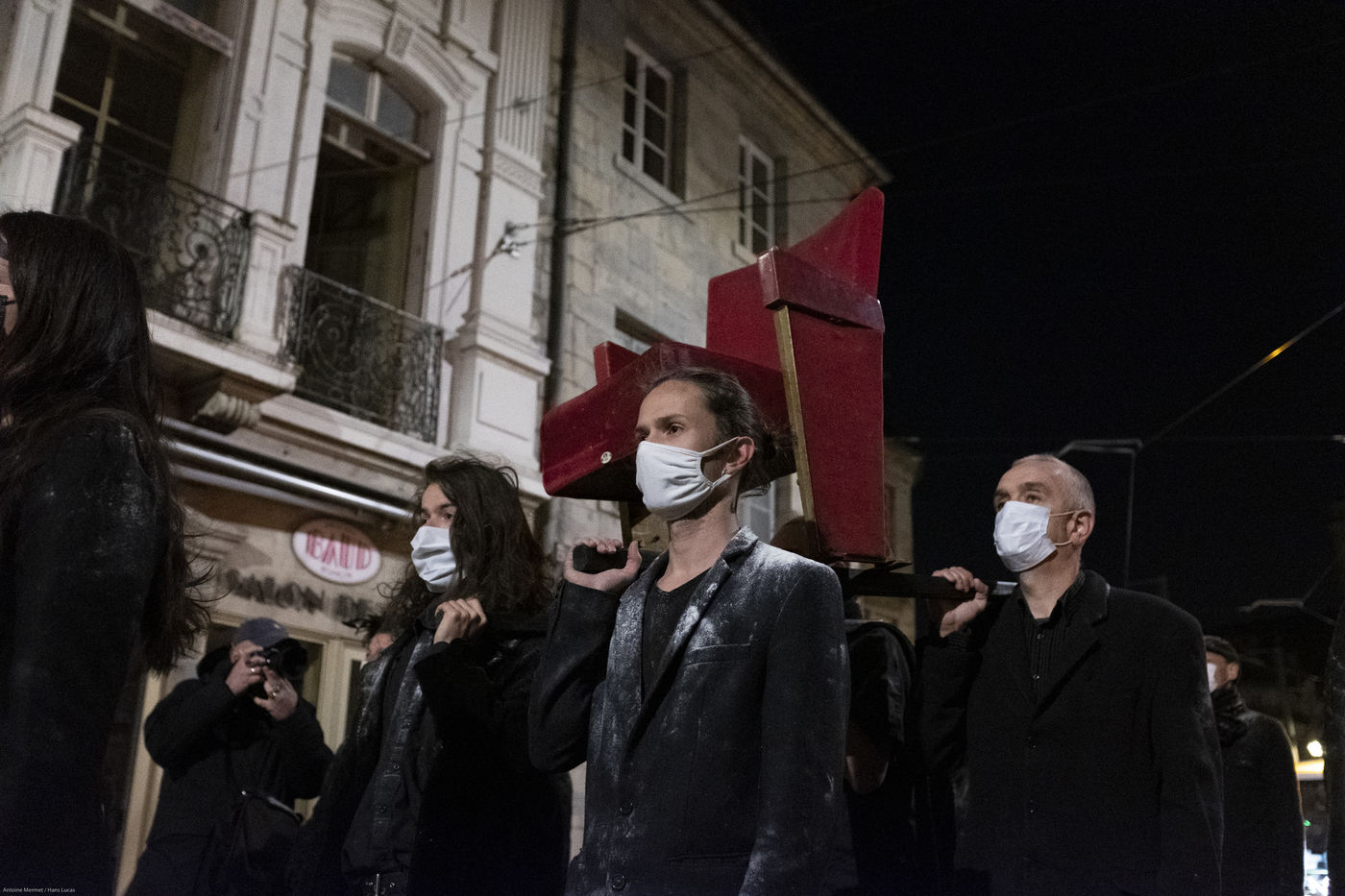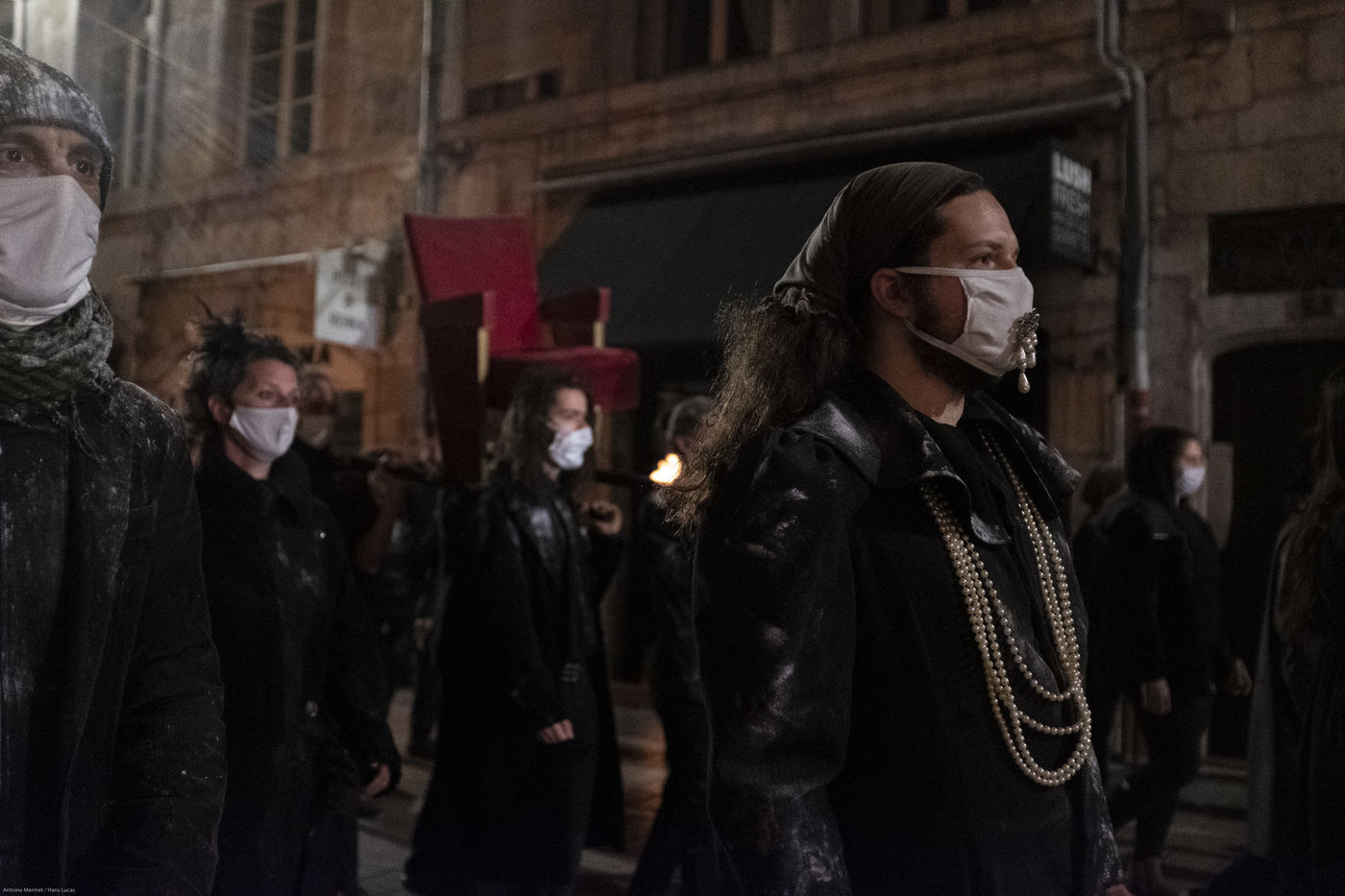 Toutes et tous vêtu.e.s de noir et poudré.e.s de farine, pour évoquer la mise au placard des costumes, le groupe déambulera, d'un pas extrêmement lent et coordonné au rythme d'un chant ininterrompu et résonnant.