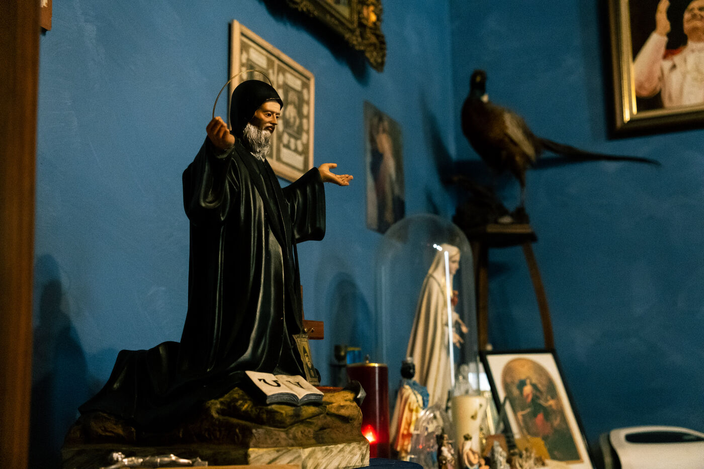 Portrait of Pierre Dulong, mayor of the village of Ligardes but also exorcist and healer, in his consulting room filled with holy icons, statues, figurines, books. The queue is long to be able to consult him for health problems or spiritual problems.