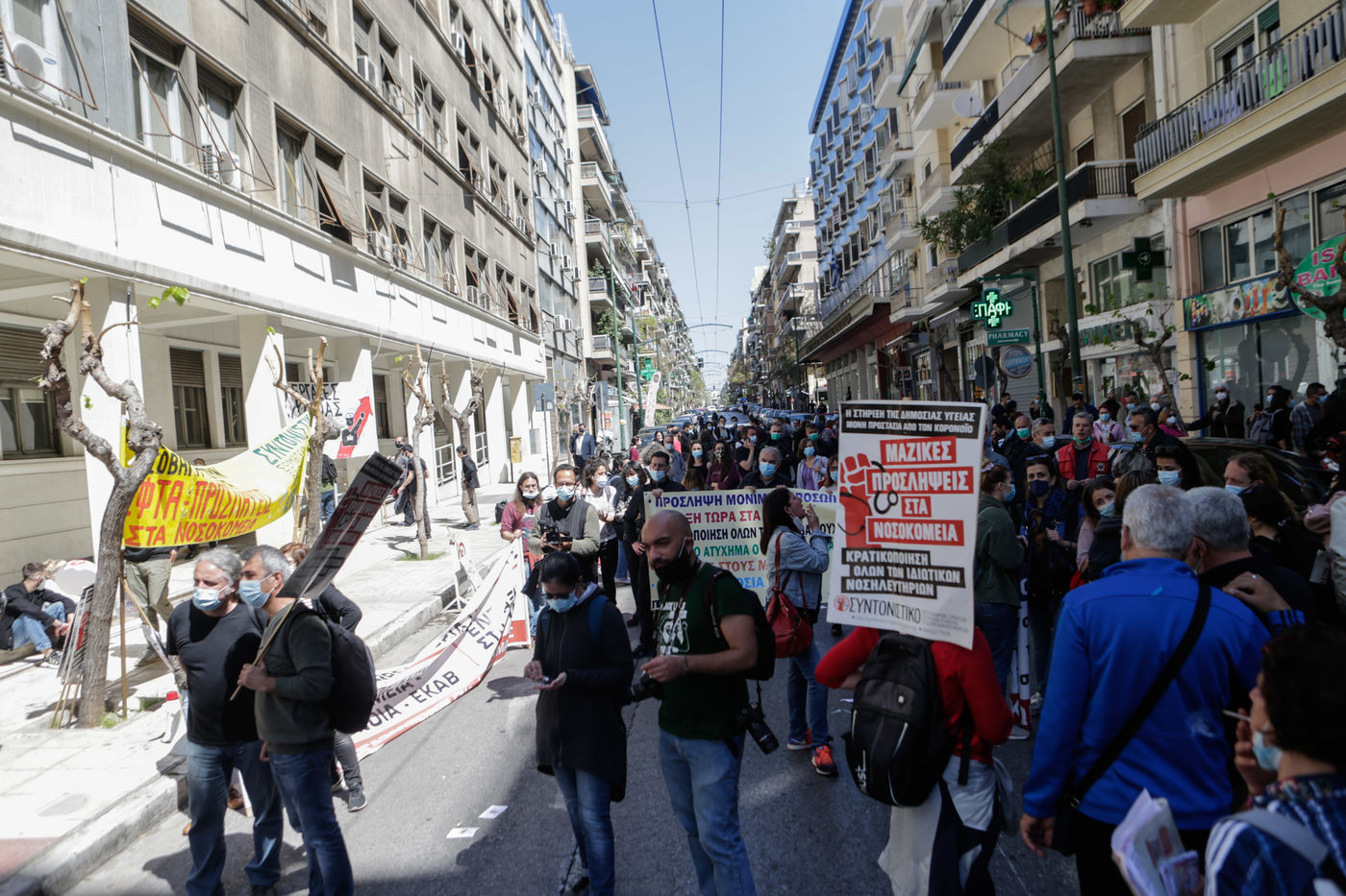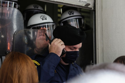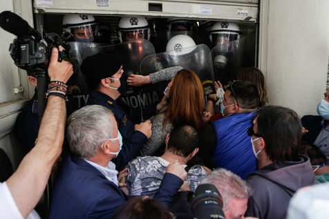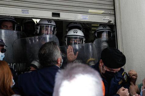 Les travailleurs de la santé des hôpitaux publics essaient de forcer l'entrée du ministère de la Santé à Athènes afin de voir le ministre de la Santé, Vasilis Kikilias. Les agents de santé ont fait la grève aujourd'hui pour montrer leur mécontentement face à la gestion, par le gouvernement, de la pandémie de covid-19.
