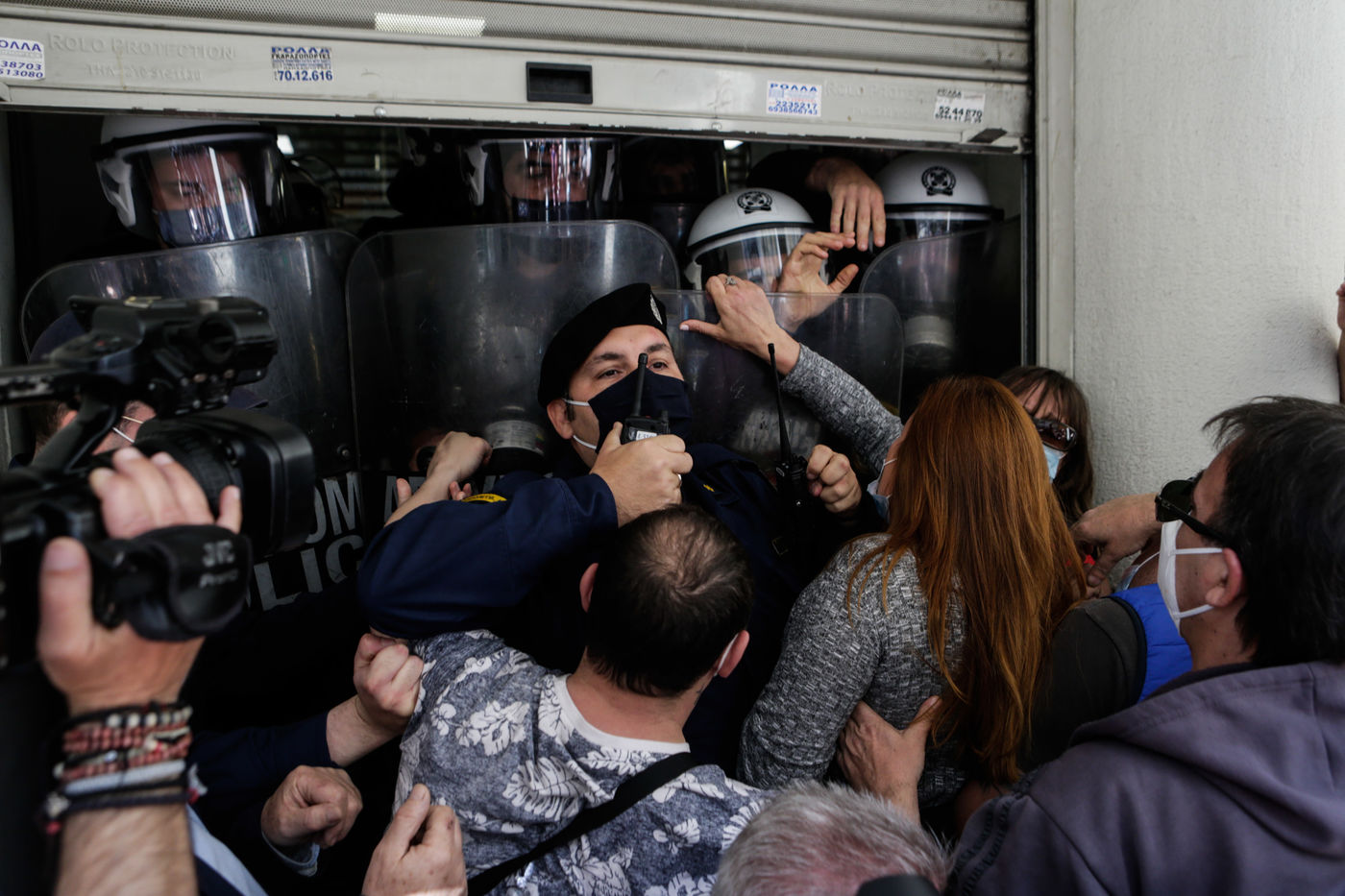 Health workers at public hospitals try to push their way through the entrance of the Ministry of Health in Athens in order to see the Minister of Heath, Vasilis Kikilias, during a rally. Health workers have been striking today to show their dissatisfaction with the handling, by the government, of the covid-19 pandemic.