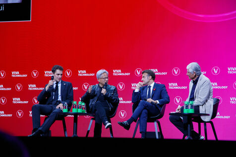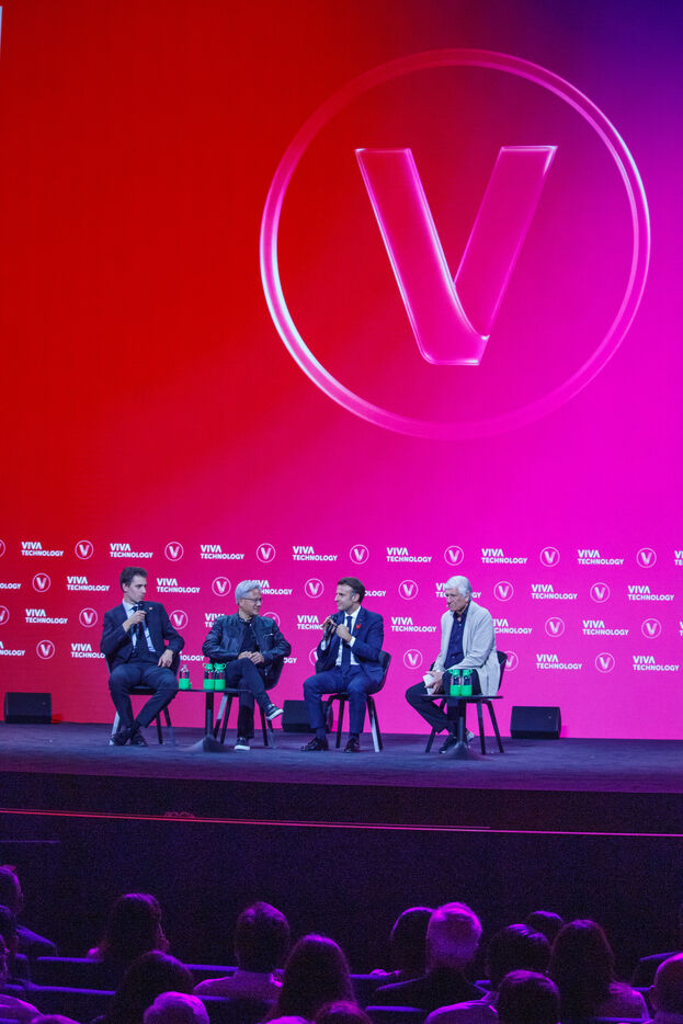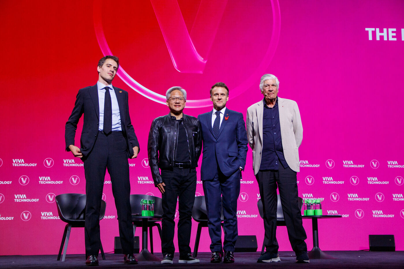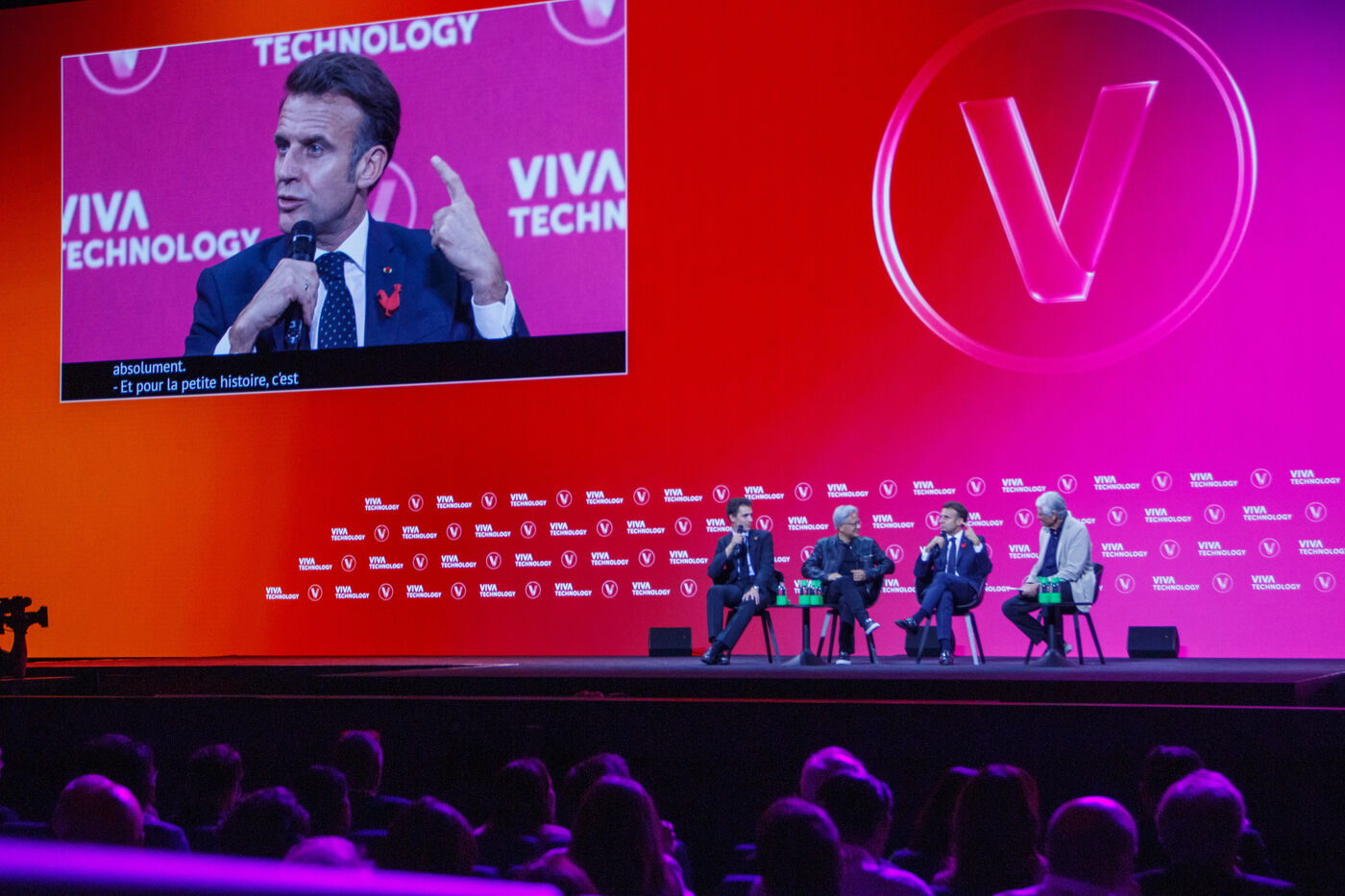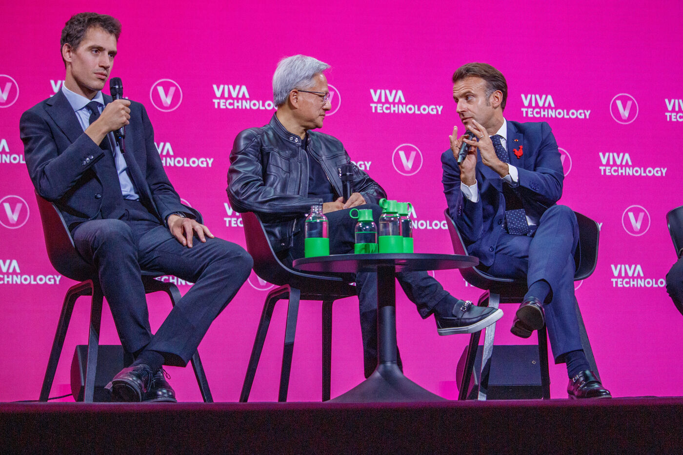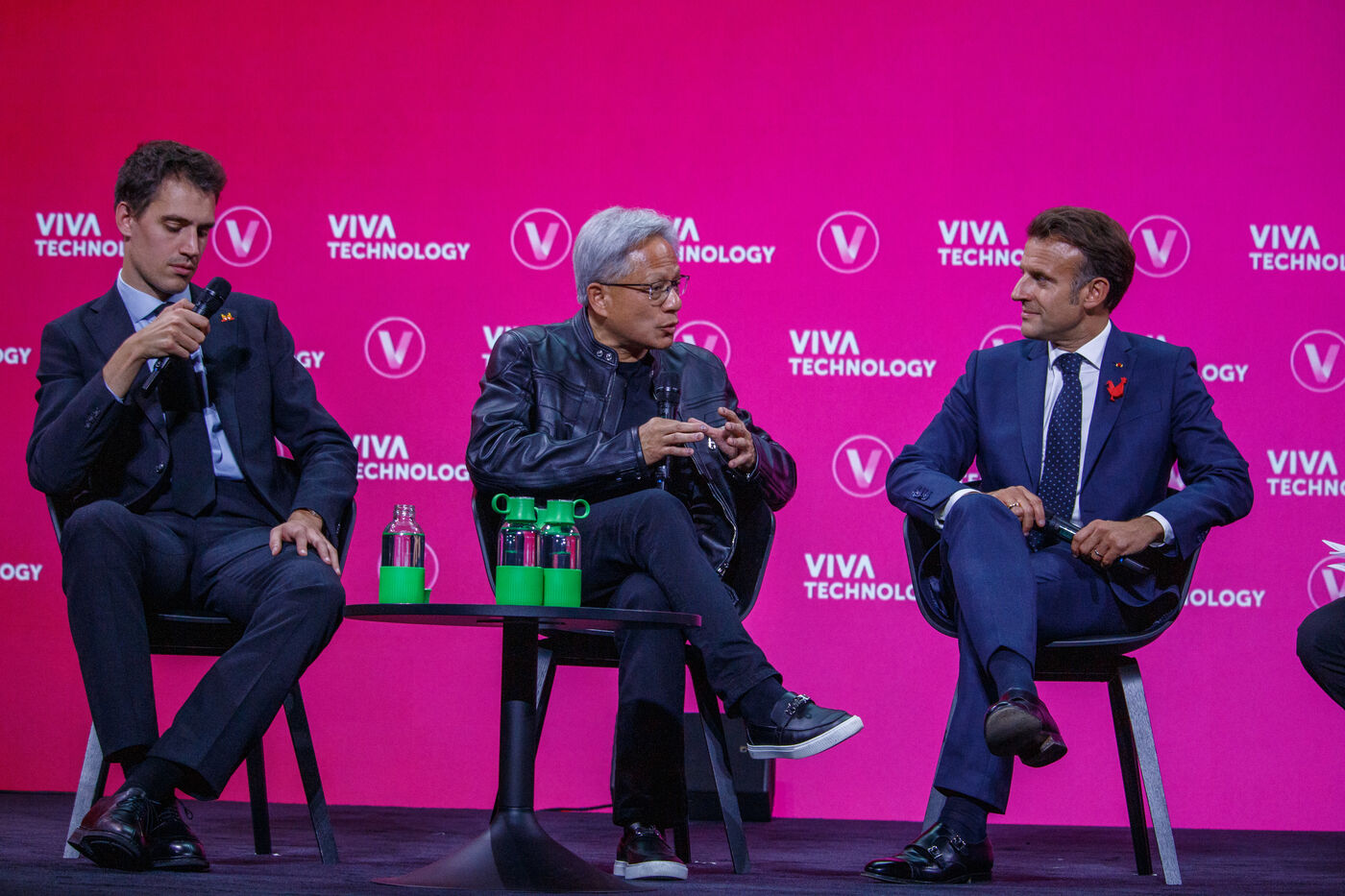 Arthur Mensch of Mistral AI, Jensen Huang, CEO of Nvidia, and President Emmanuel Macron on stage at Vivatechnology in Paris, France on June 11, 2025.