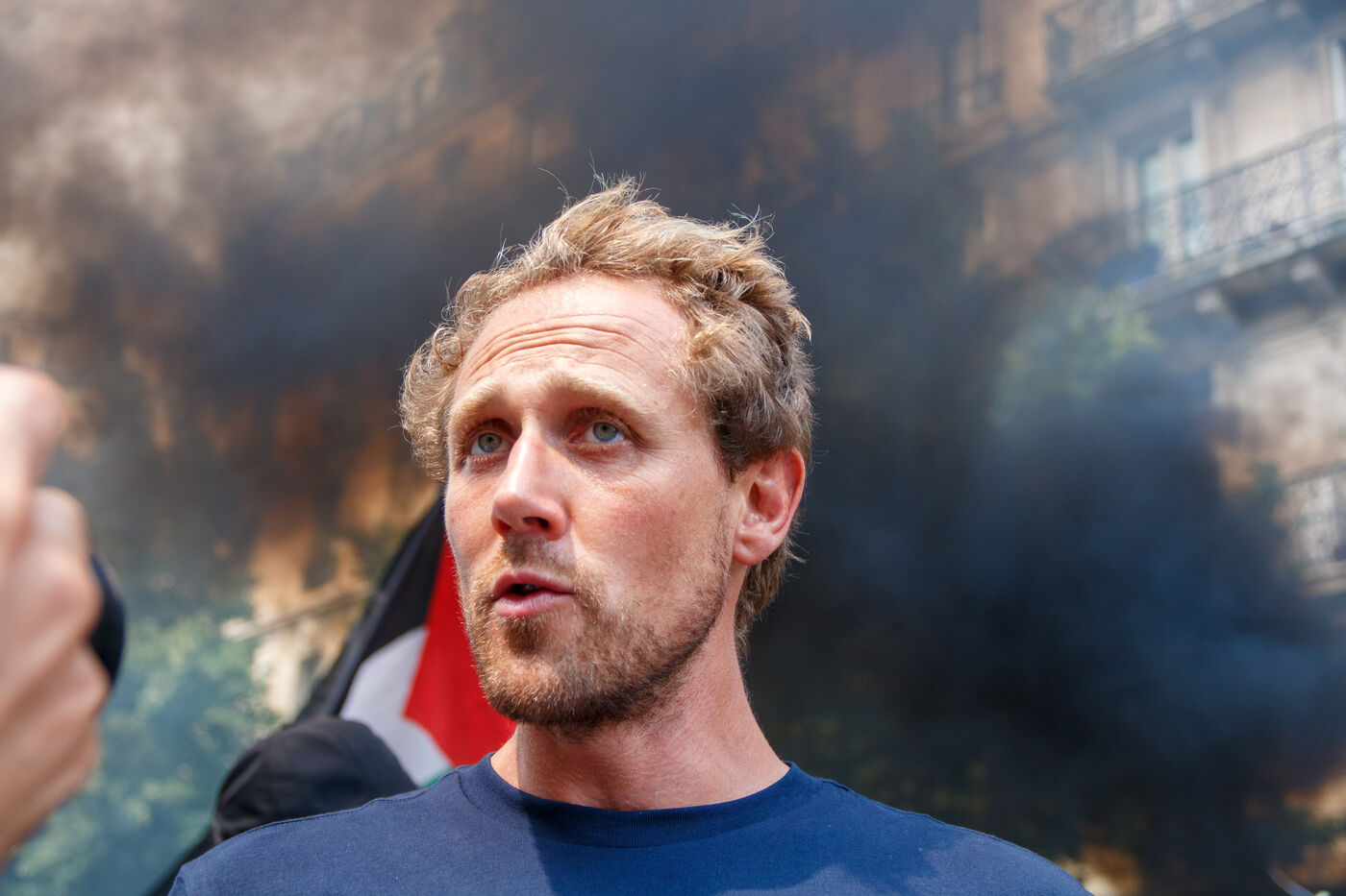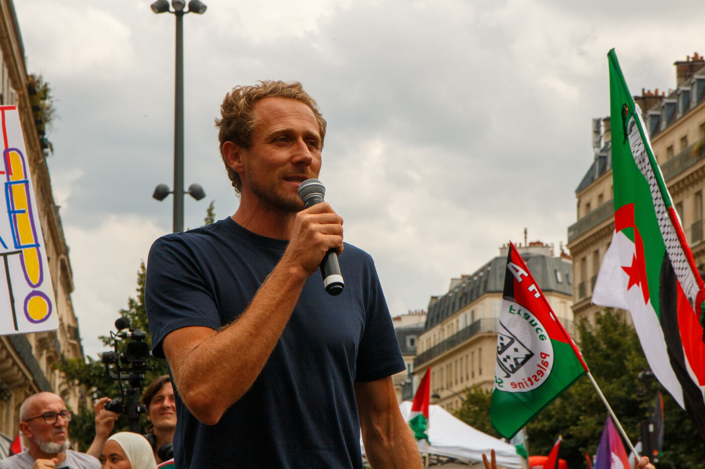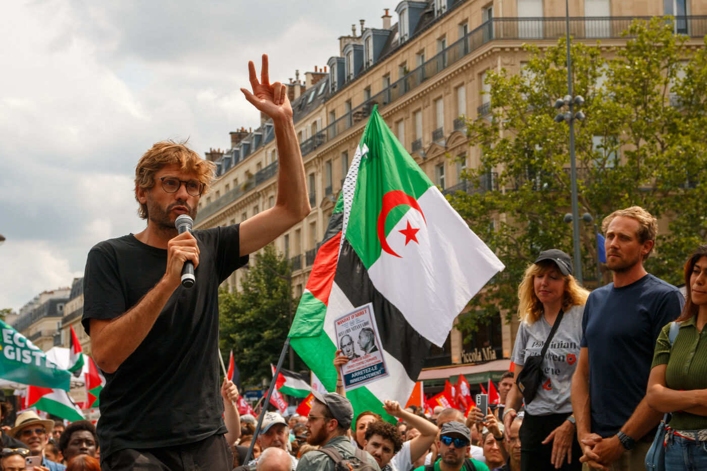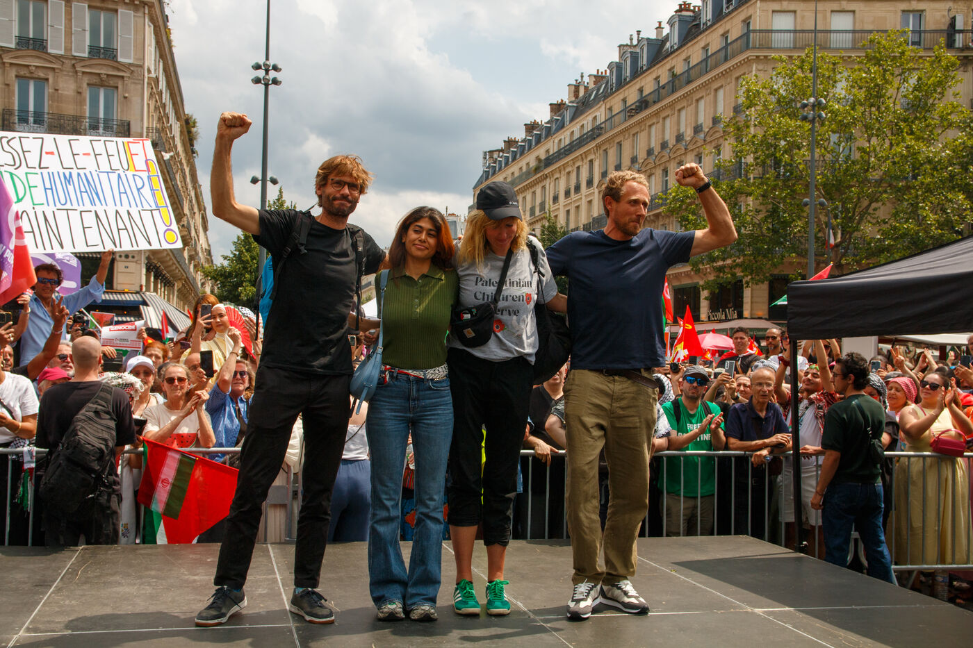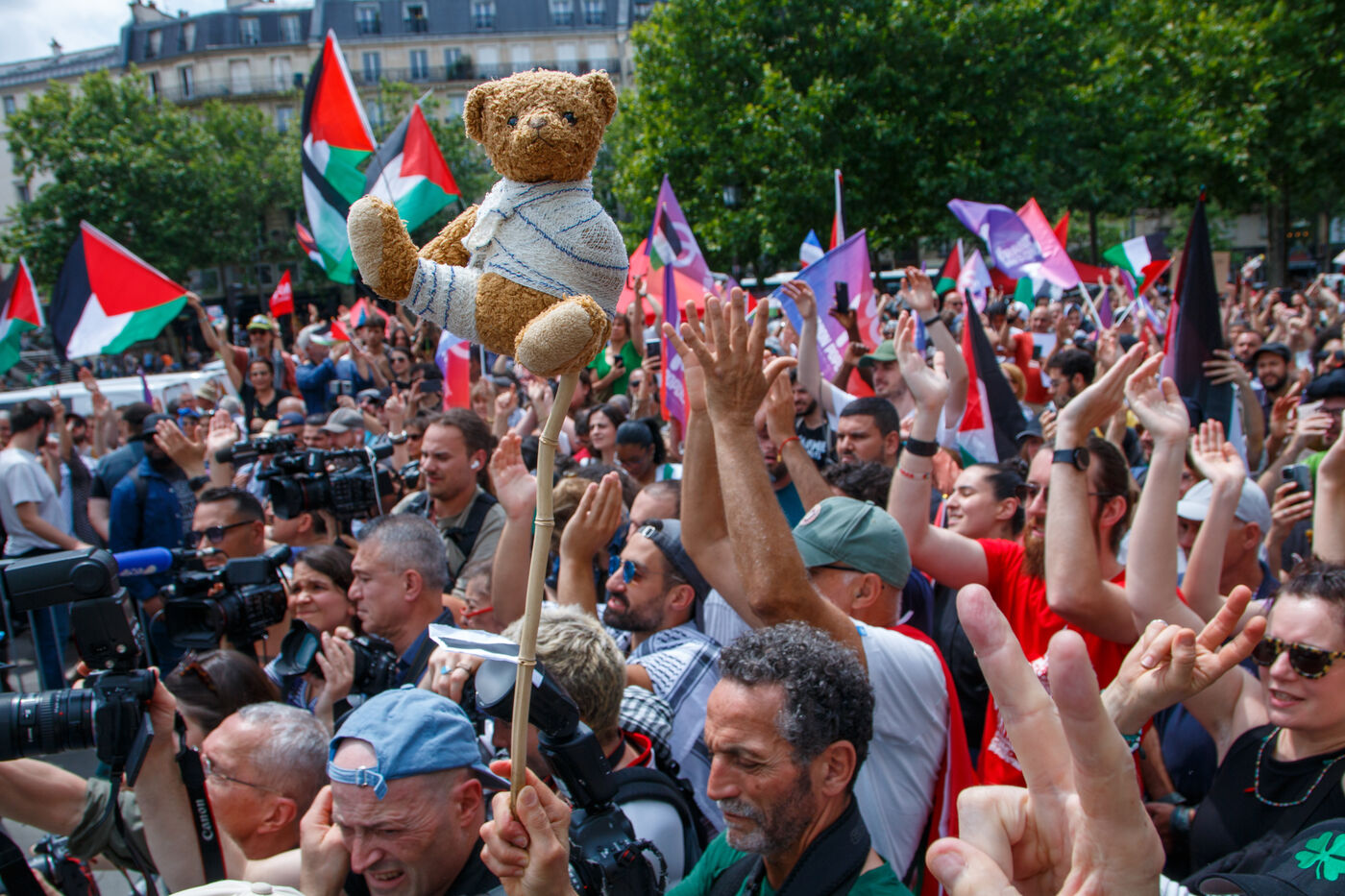 Demonstration following the arrest of the Madleen humanitarian boat, and in support of the people of Gaza, against the ongoing genocide and for an immediate ceasefire, Place de la République, in Paris, France on June 14, 2025.