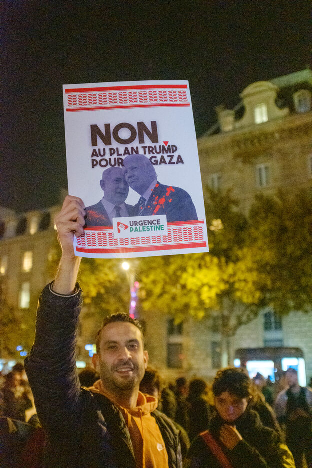 Demonstration to celebrate the return of the crews of the boats of the humanitarian flotilla Global Sumud (Thousand Madleens and Freedom Flotilla Coalition) and to demand the release of the crews of the last flotilla to break the blockade of Gaza in Palestine arrested in their mission by the Israeli army in international waters, for the end of the genocide and for sanctions against Israel, pro-Palestinian demonstrators, in Paris, France on October 8, 2025.