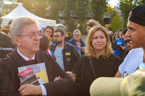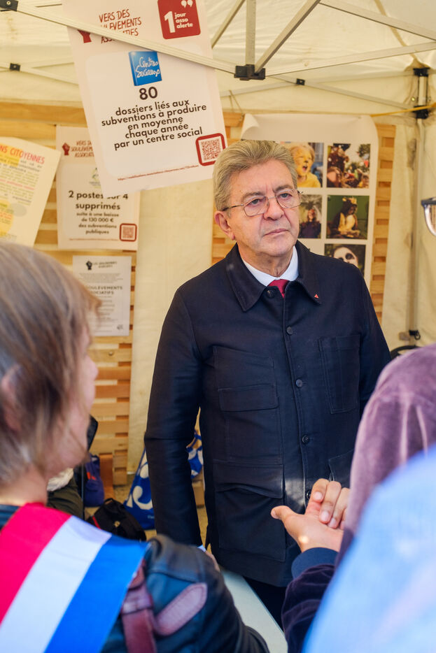 Portraits of Jean-Luc Mélenchon, leader of LFI, during the gathering of associations against budget cuts, on the Place de la Bataille de Stalingrad, October 11, 2025.
