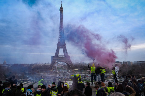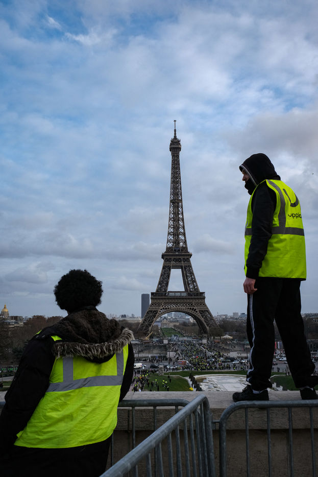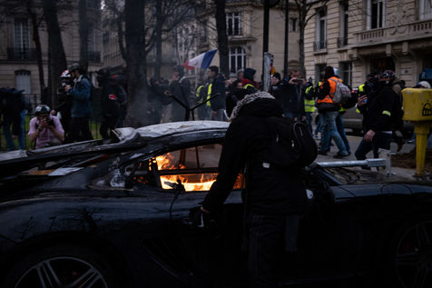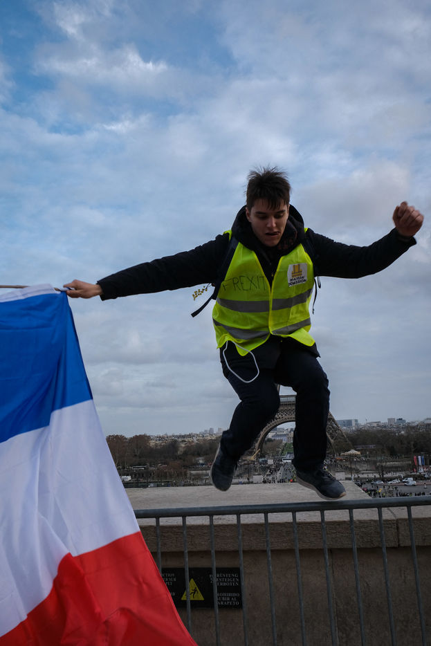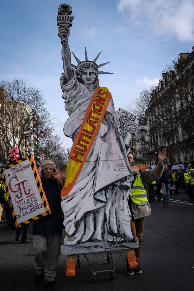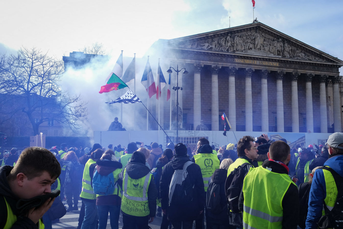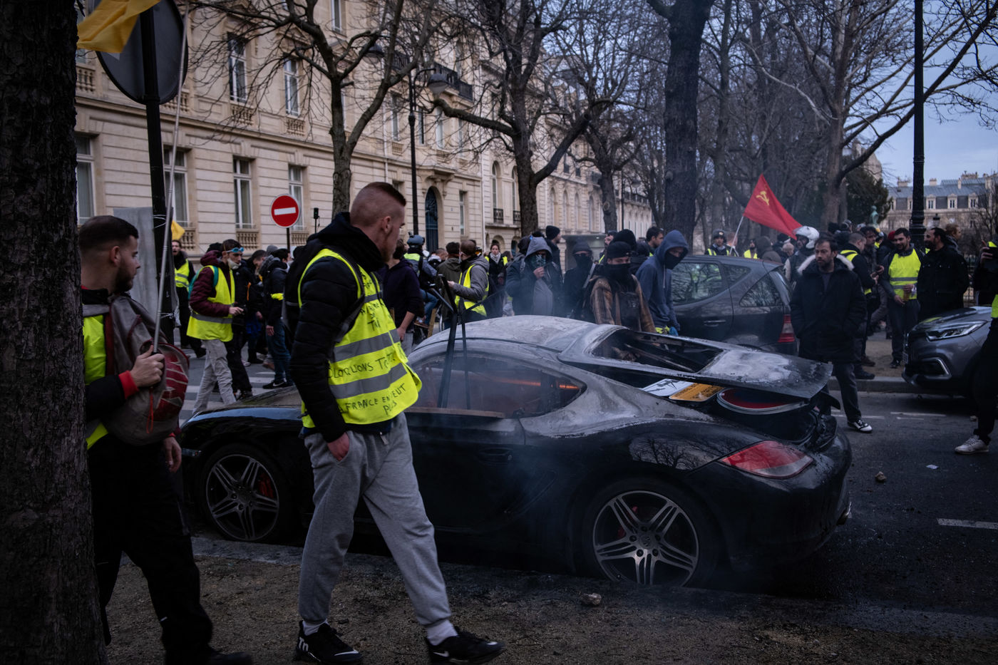 Treizième samedi de mobilisation des gilets jaunes dans la capitale. Le parcours de la manifestation, déposé en préfecture, comprenait des passages devant les lieux de pouvoir de la capitale. C'est devant l'Assemblée nationale que les premiers affrontements violents éclatent. Un manifestant perd quatre doigts lors de l'explosion de ce qui semble être une grenade utilisée par les forces de l'ordre. Après sa prise en charge par des équipes de soin, la progression du cortège se poursuit, marquée par des destructions de matériels urbains, de véhicules, dont certains de l'opération sentinelle, et le saccage de banques. Arrivée au Champs de mars qui devait êre la fin du parcours, les gilets jaunes prennent le chemin du trocadéro pour continuer à avancer dans la capitale avant d'être dispersés par les forces de l'ordre.