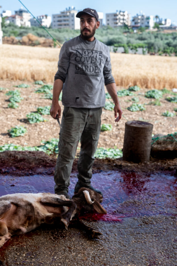 Sheep owners who do not wish to perform the sacrifice themselves bring it to the farmer, Jadallah, who will have the slaughter performed while praying to God and ensuring that the sheep do not see the knife.