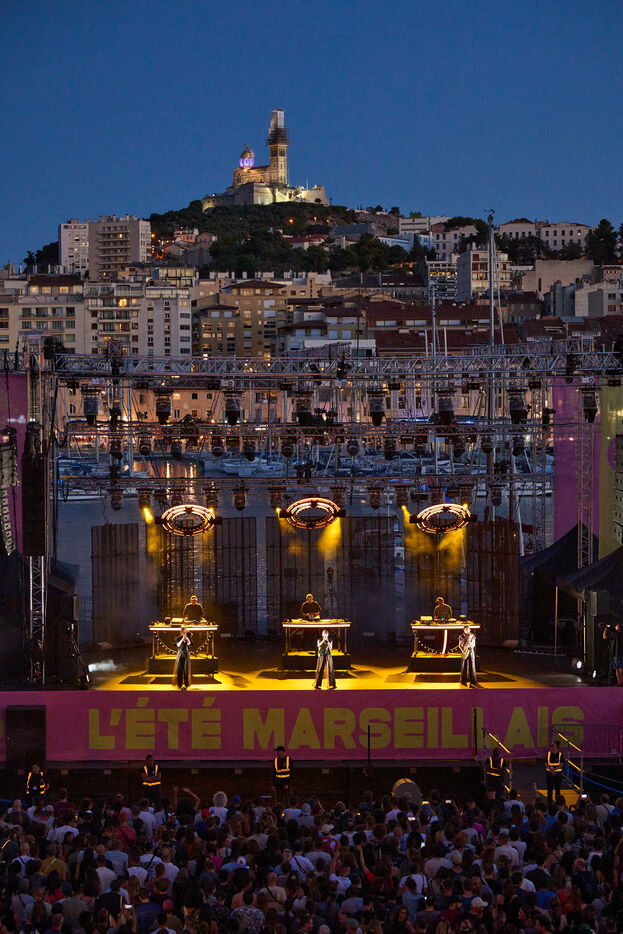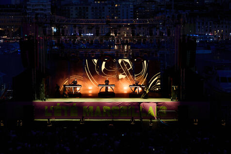 Le collectif Chinese Man fête ses 20 ans sur la scène sur l'eau, durant l'Eté marseillais organisé par la Mairie de Marseille. Images du trio sur scène et du public.