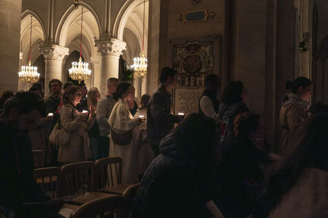 On Monday, April 21, 2025, Notre-Dame Cathedral in Paris hosted a prayer vigil in honor of Pope Francis, who passed away that morning at the age of 88. At 11 a.m., the cathedral's bells tolled 88 times, symbolizing each year of his life. Masses were held at noon and 6 p.m., followed by a rosary at 7 p.m. and a prayer vigil from 8 p.m. to midnight, presided over by Auxiliary Bishop Emmanuel Tois. Faithful gathered in a solemn atmosphere, surrounded by candles and prayers, to pay tribute to a pontiff who profoundly impacted the Church and the world.