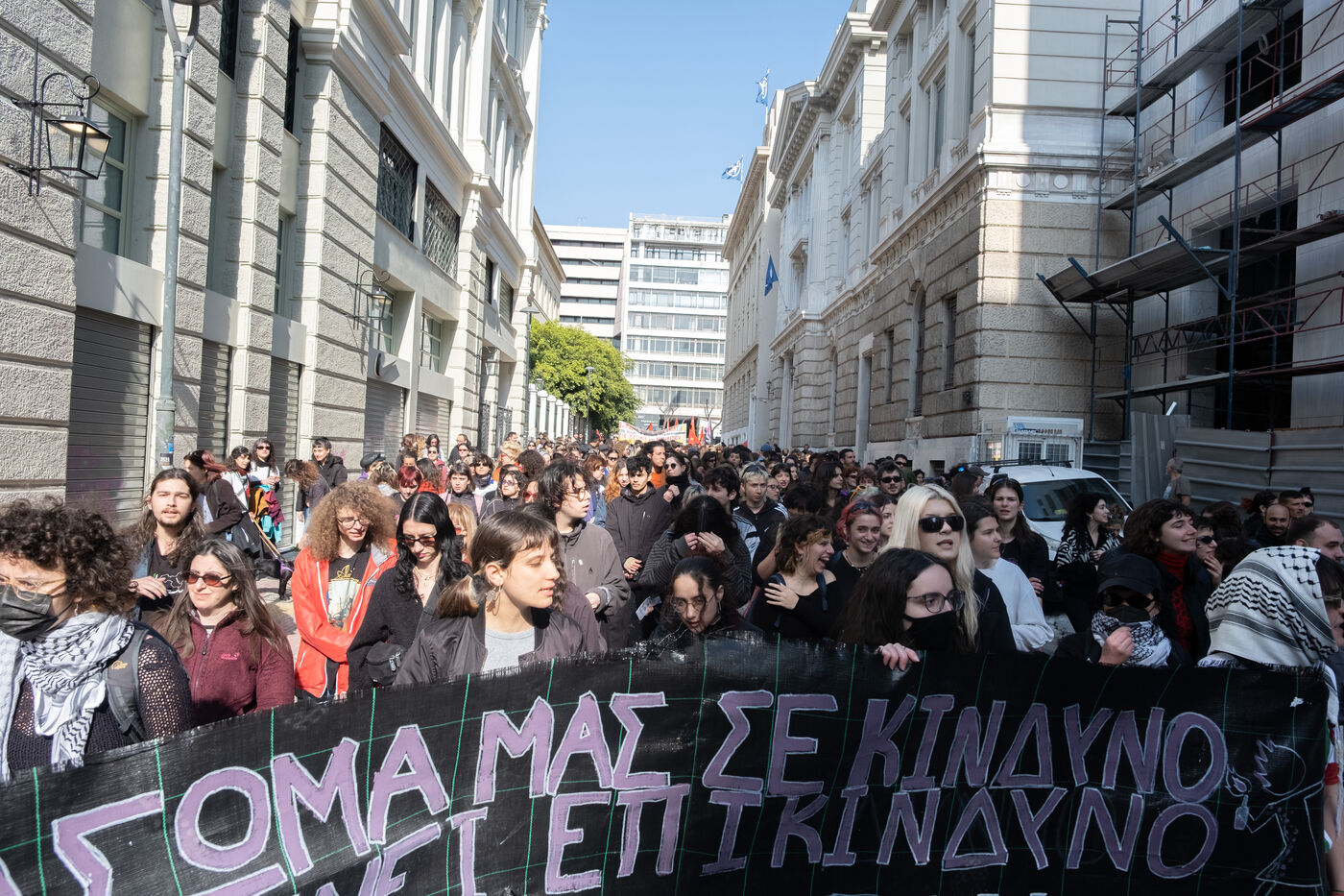 Des femmes et leurs alliés participent à un rassemblement pour la Journée internationale des femmes dans le centre d'Athènes, en Attique, en Grèce, le 8 mars 2026. La manifestation met en lumière l'activisme féministe et les revendications en faveur de l'égalité des droits et de la justice sociale.