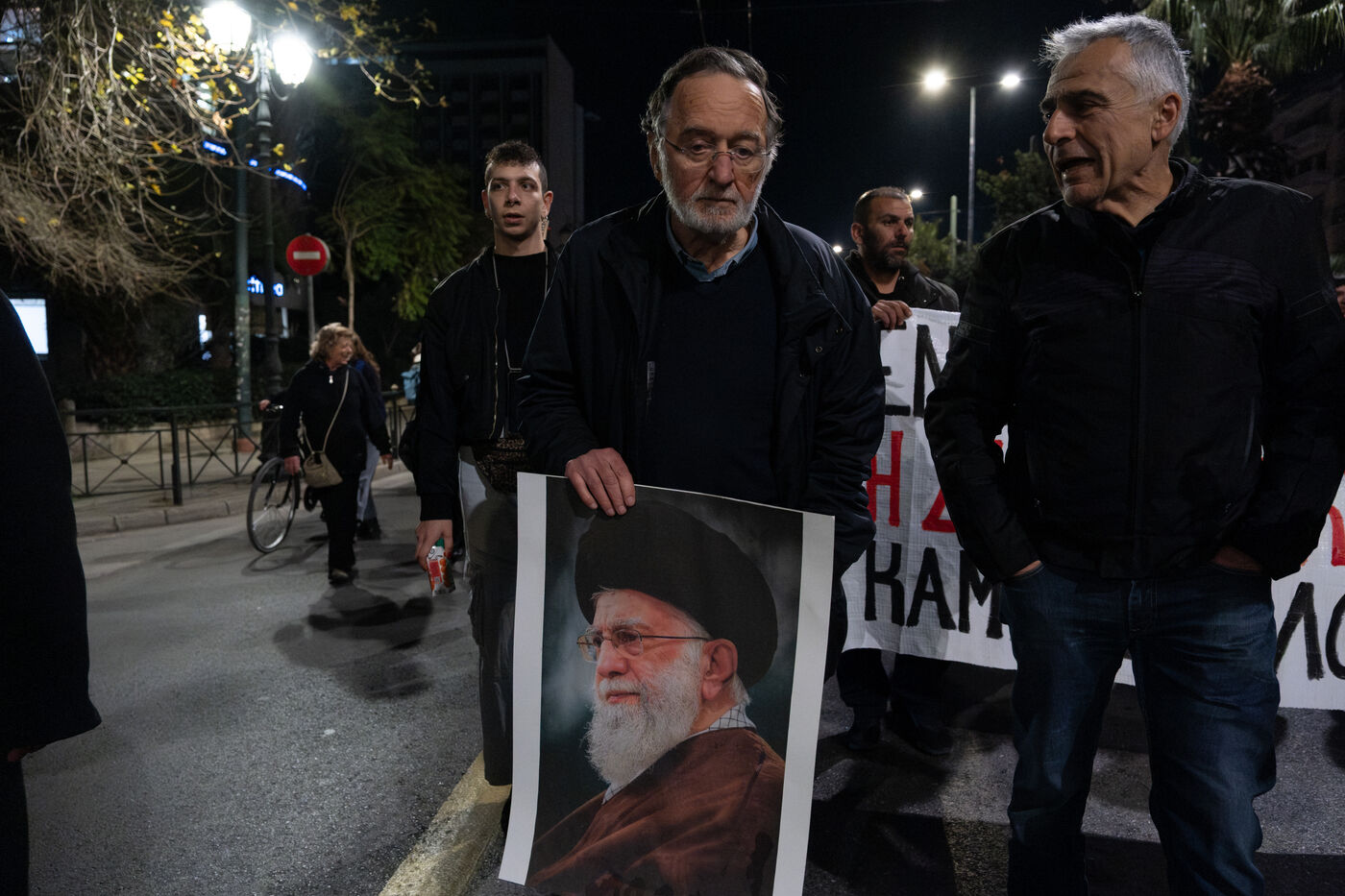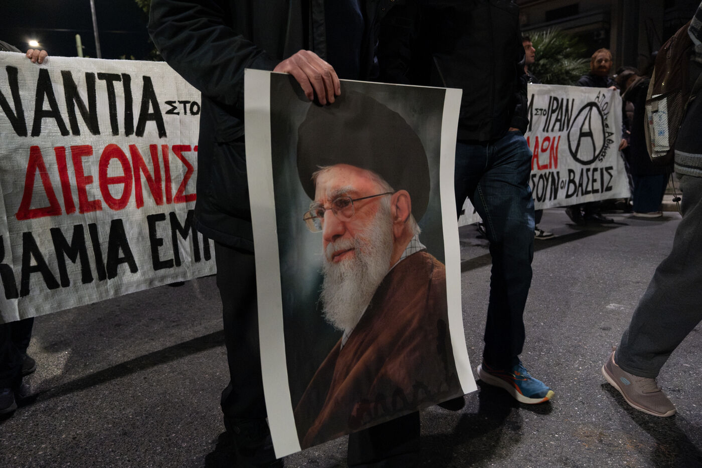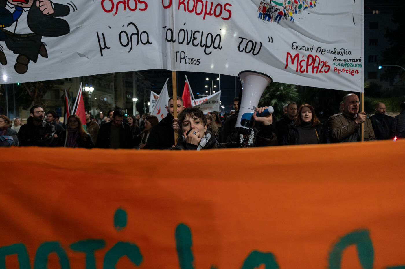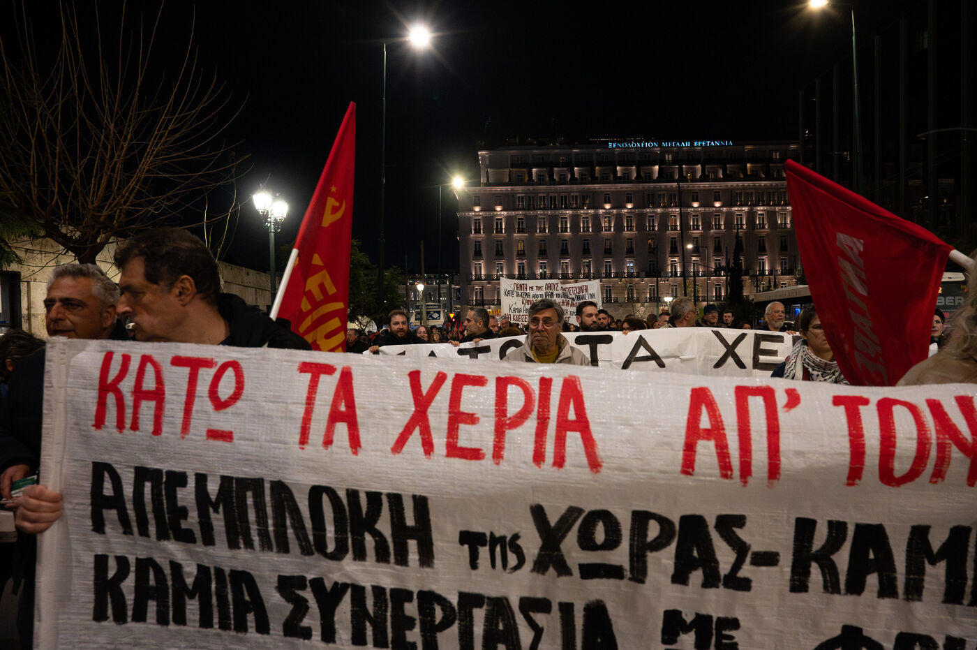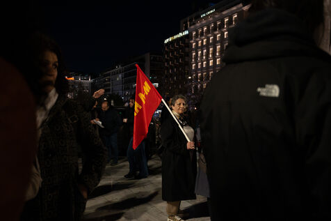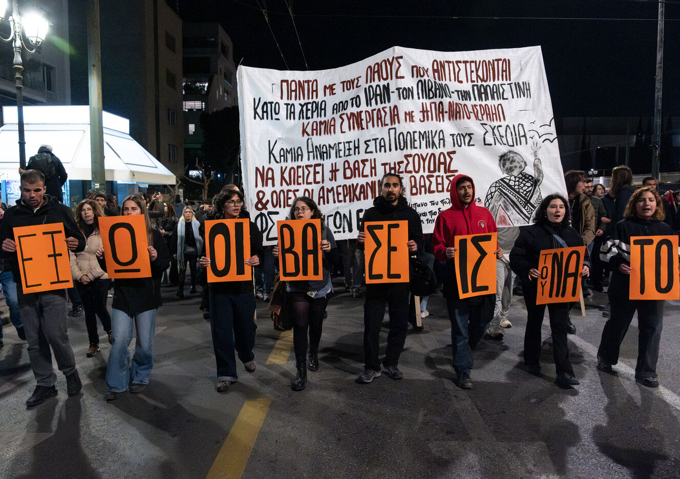 Demonstrators gathered during an anti war rally with banners and placards near Syntagma Square in Athens in Attica in Greece on March 12, 2026. Participants assemble in central Athens to express opposition to war and call for peace during a public protest in front of government buildings.