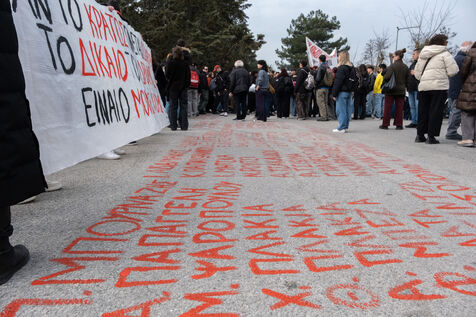 People gather at the Geopolis conference center of the University of Thessaly for the opening of the trial related to the Tempi railway accident in Larissa, Greece on March 23, 2026. The proceedings mark a significant judicial moment following one of the country most deadly rail disasters, drawing attention from victims families, officials and the public.