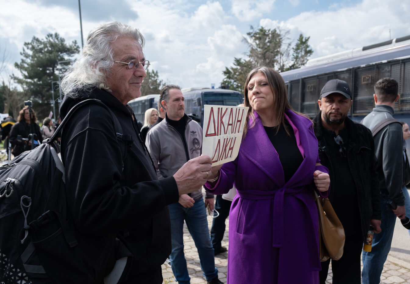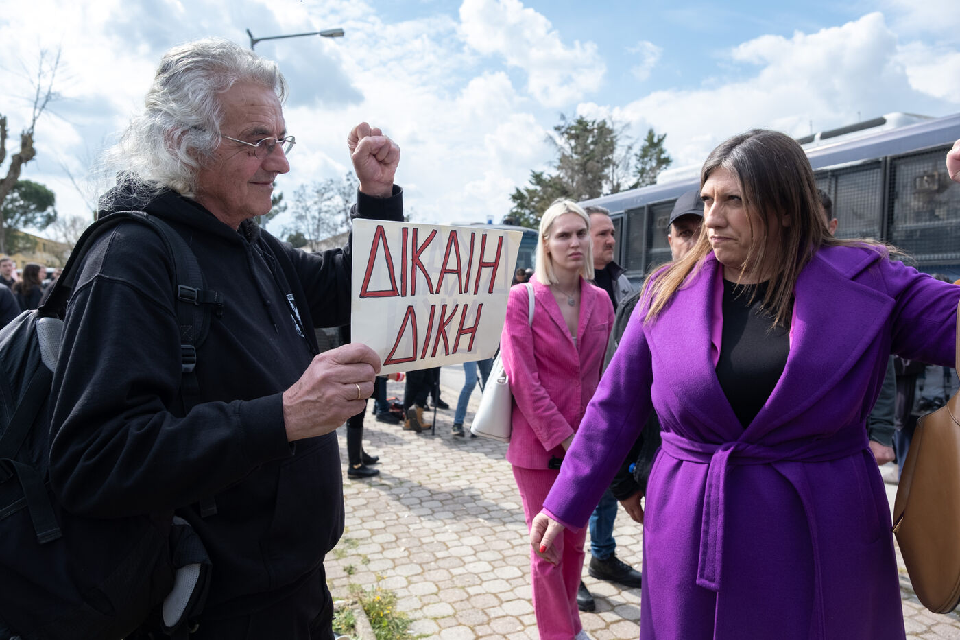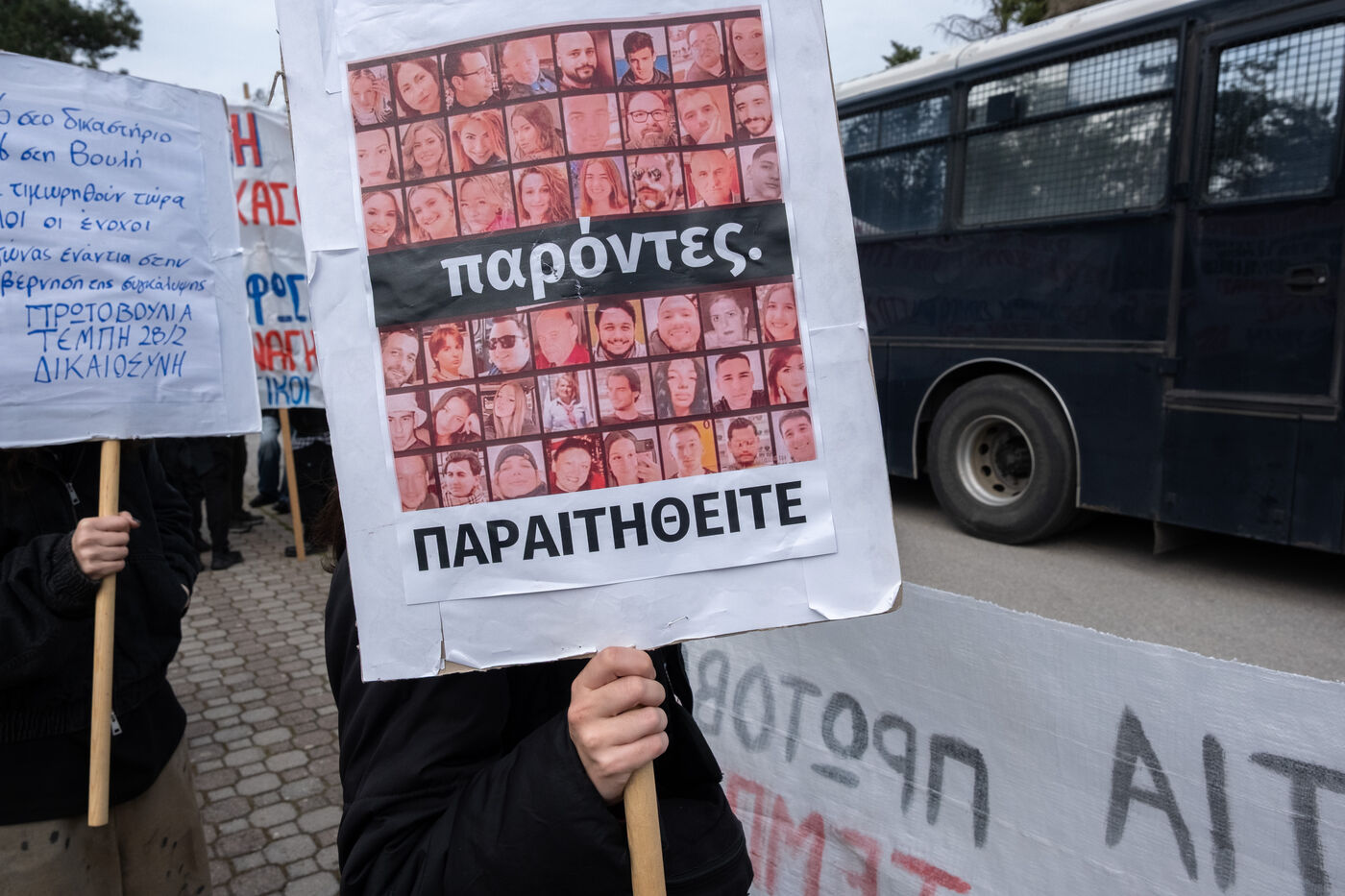 Des personnes se rassemblent au centre de conference Geopolis de l Universite de Thessalie pour louverture du proces lie a l accident ferroviaire de Tempi a Larissa en Grece le 23 mars 2026. Les audiences marquent un moment judiciaire majeur apres lun des accidents ferroviaires les plus meurtriers du pays, attirant l attention des familles des victimes, des autorites et du public.