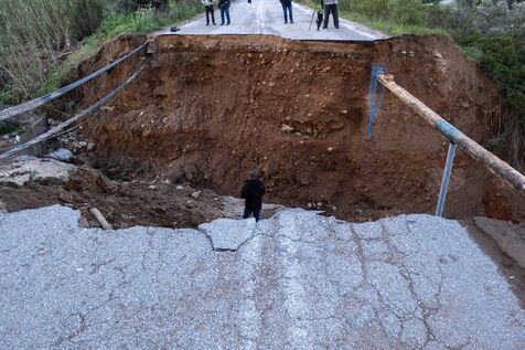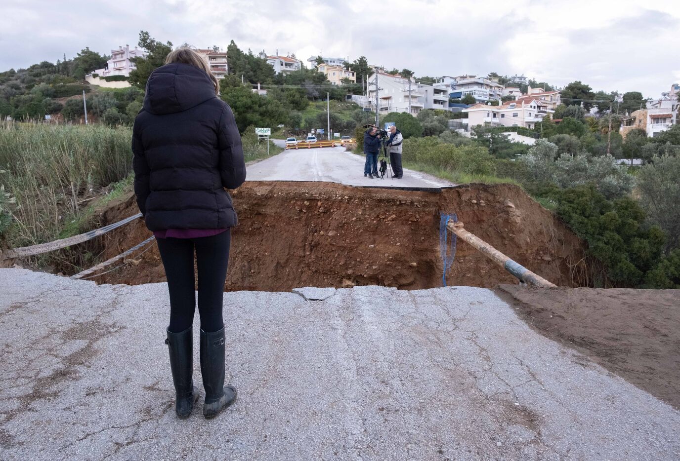 Flooded houses and damaged infrastructure after severe weather in Nea Makri and Penteli in Attica in Greece on April 2, 2026. Residents assess destruction and try to save property while strong waters from storm Erminio created a large ravine and swept away vehicles highlighting the impact of extreme weather events.