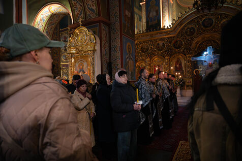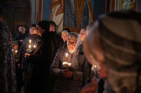 Worshippers attend Holy Thursday service inside St Michaels Cathedral in Kyiv Ukraine on April 9, 2026. The scene shows Orthodox believers gathered in prayer with candles and religious icons during Easter week rituals.