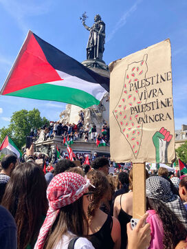A l'appel de plusieurs organisations de la jeunesse (Union étudiante, Union syndicale lycéenne, Comité Palestine Sorbonne, Rassemblement pour l'égalité et la démocratie, Comité Palestine Sciences-Po), des milliers de manifestants se sont réunis en soutien à la Palestine et pour dénoncer le génocide mis en oeuvre par le gouvernement israélien, le dimanche 25 mai 2025 sur la place de la République, Paris, France.
