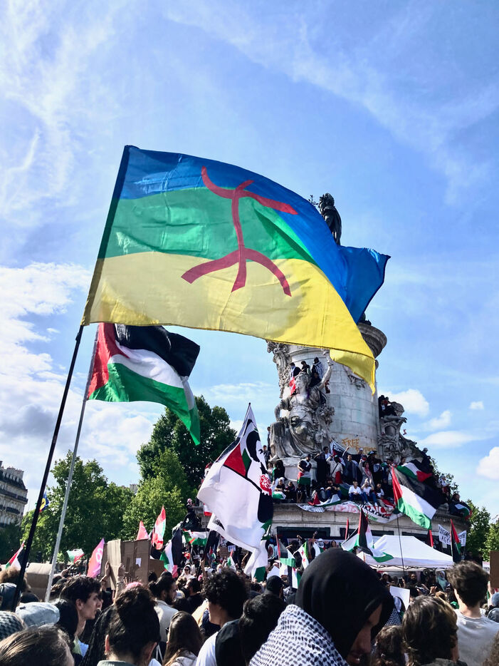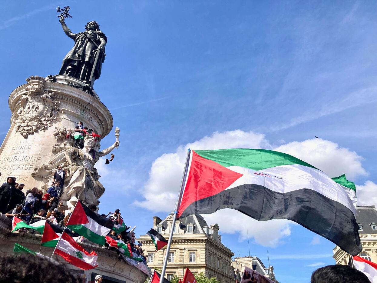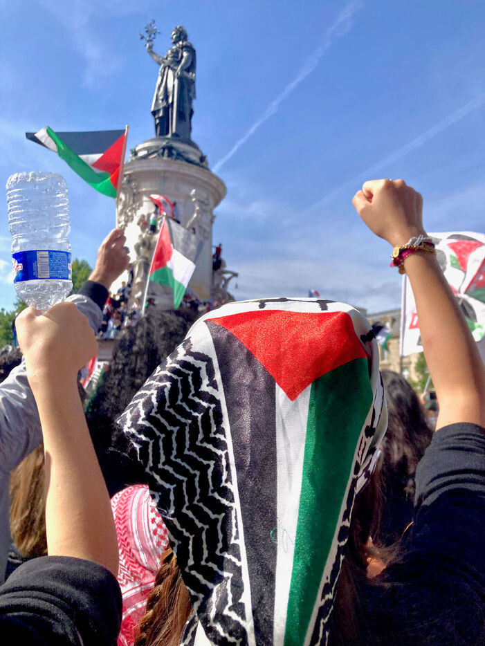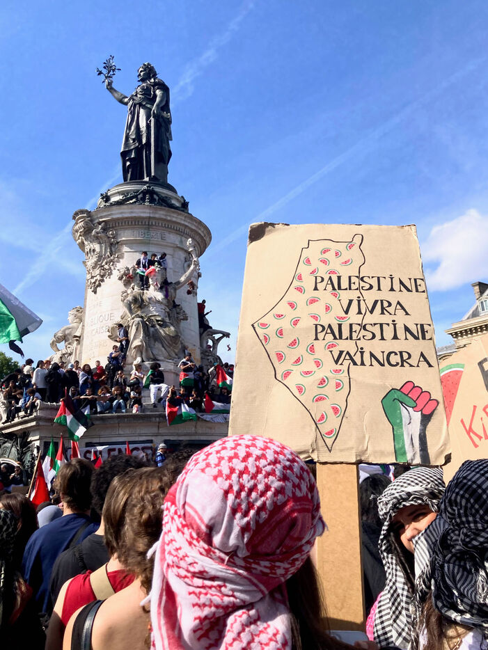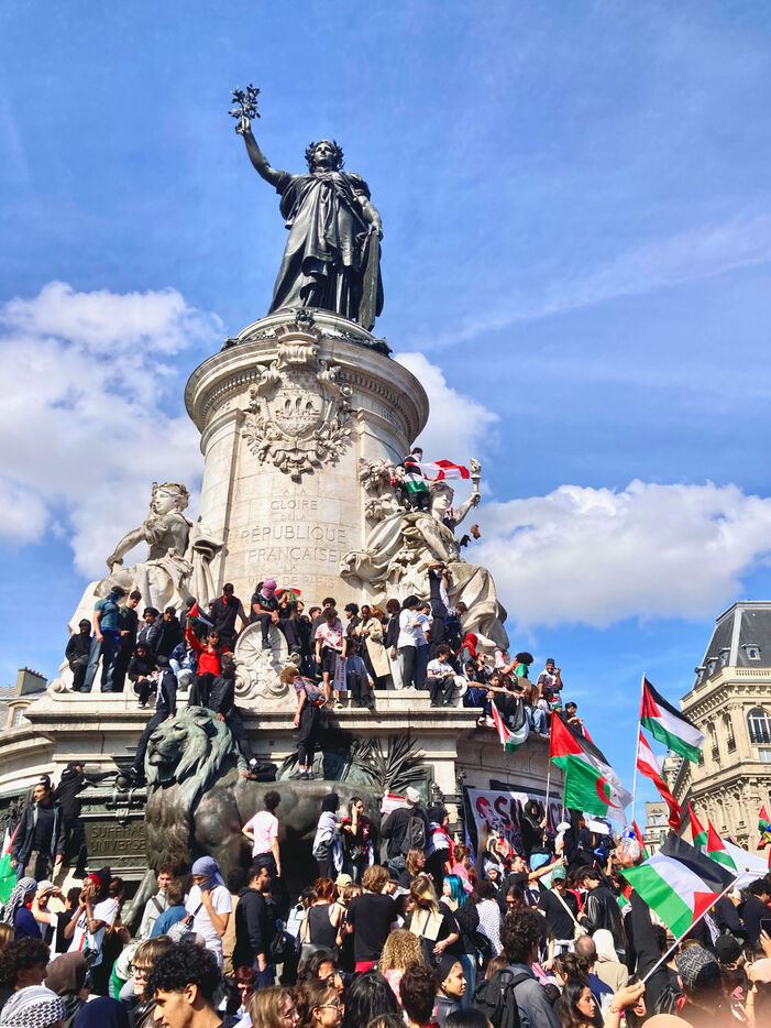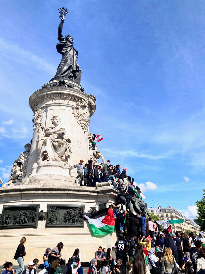 At the call of several youth organizations (Union etudiante, Union syndicale lyceenne, Comite Palestine Sorbonne, Rassemblement pour l'egalite et la democratie, Comite Palestine Sciences Po), thousands of demonstrators gathered in support of Palestine and to denounce the genocide being carried out by the Israeli government, on Sunday May 25, 2025 at Place de la Republique, Paris, France.Sur un poteau, le tag FREE GAZA a ete marque a la craie devant la statue de la Place de la Republique.