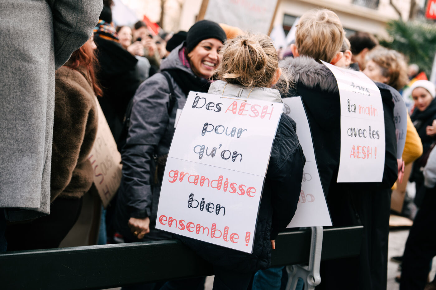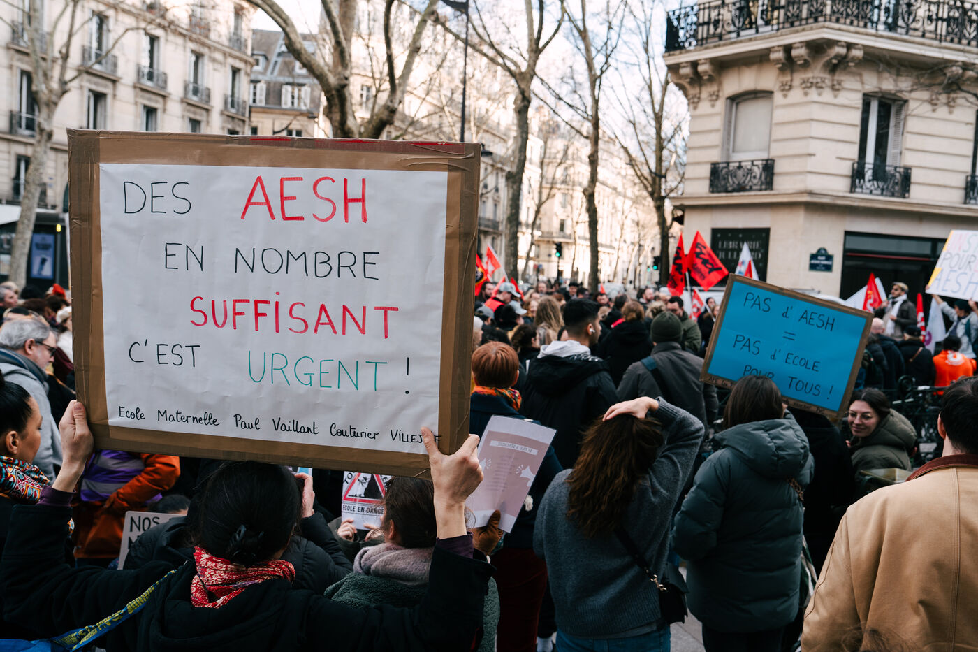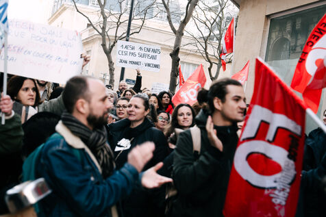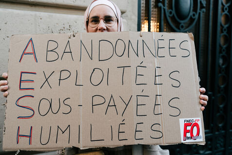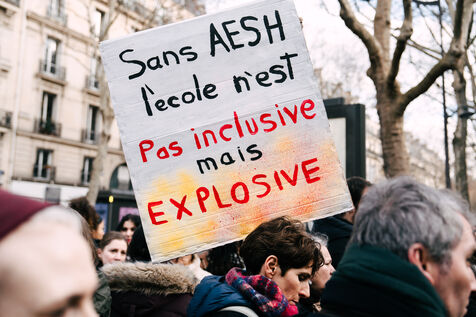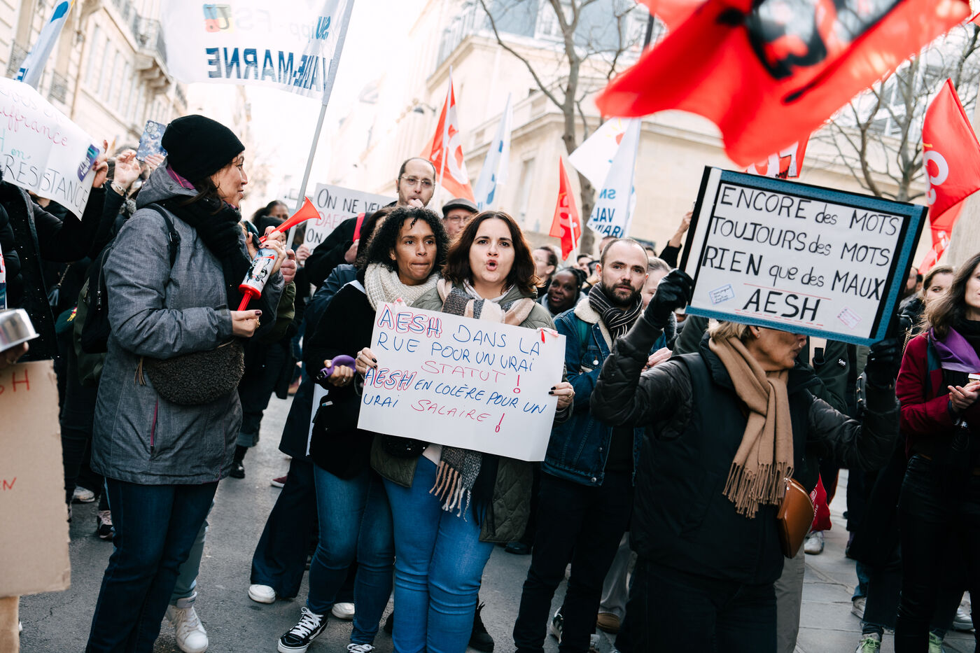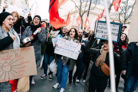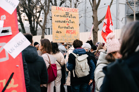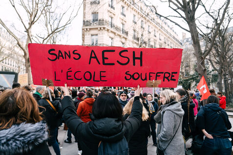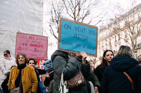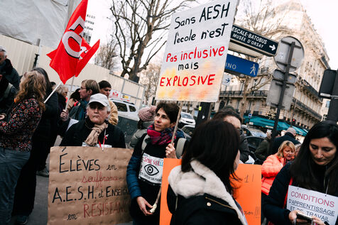 Les Accompagnant des élèves en situation de handicap (AESH) ont manifesté à proximité du ministère de l'Éducation nationale afin de réclamer de meilleurs de conditions de travail. Ce rassemblement fait suite à un rejet de proposition de loi du Sénat pour ouvrir un statut de fonctionnaire de catégorie B aux AESH.