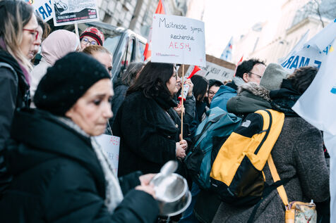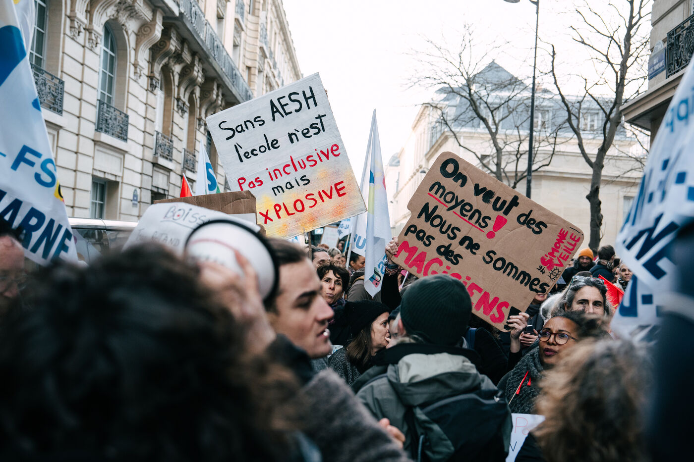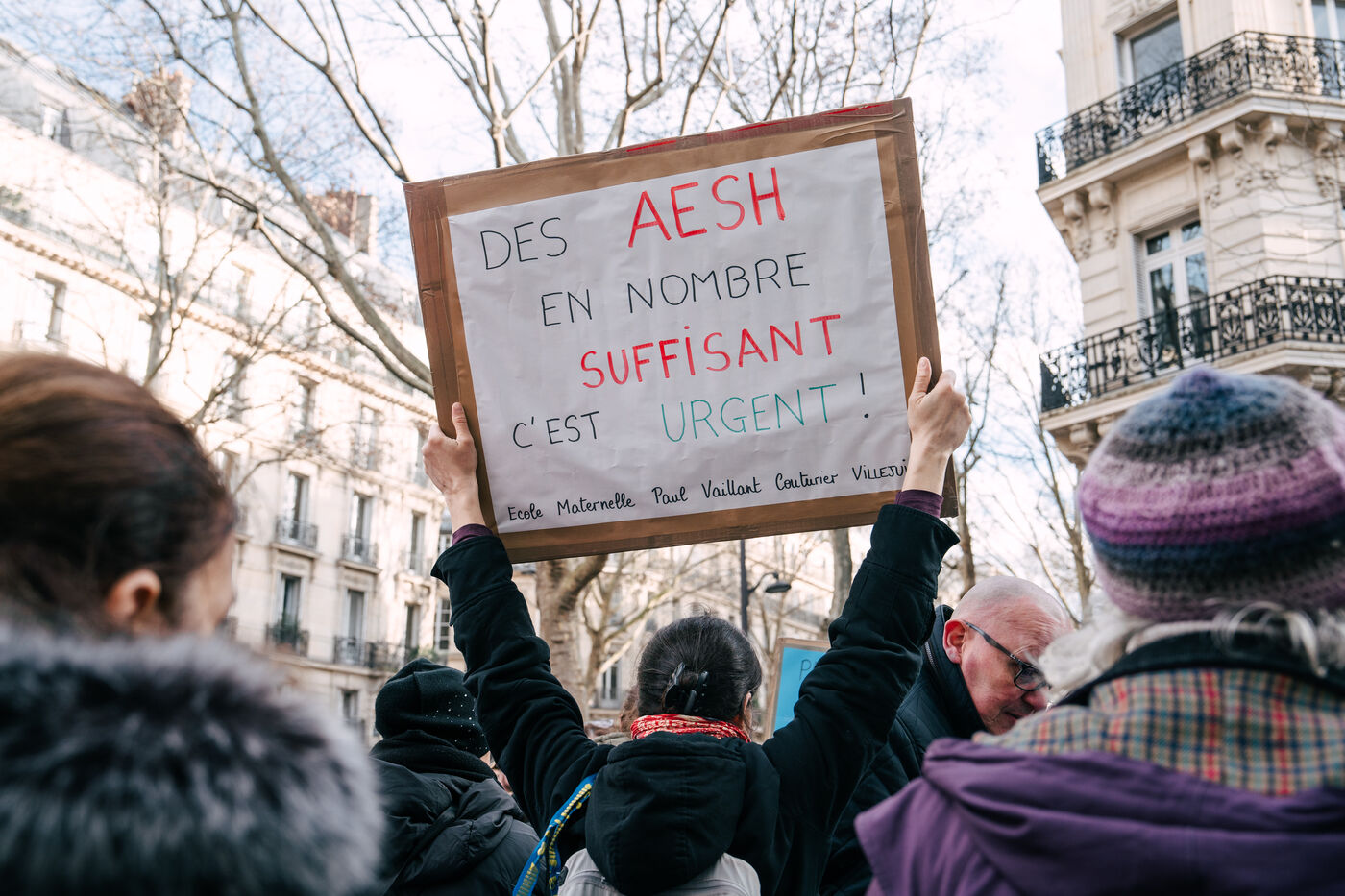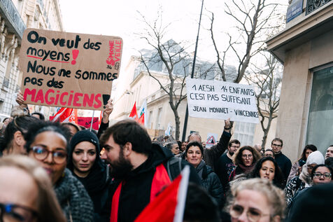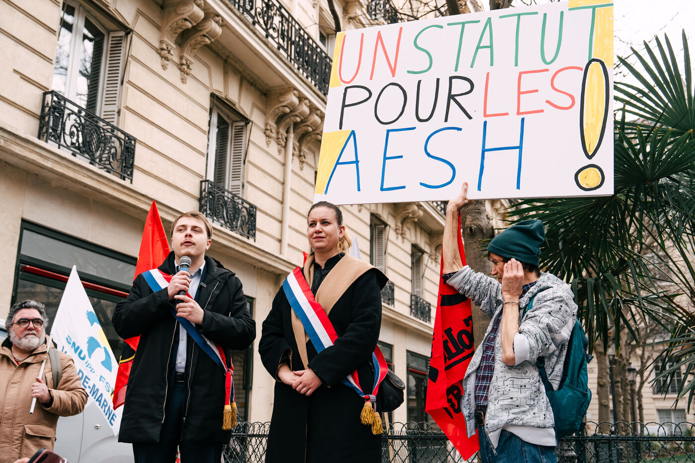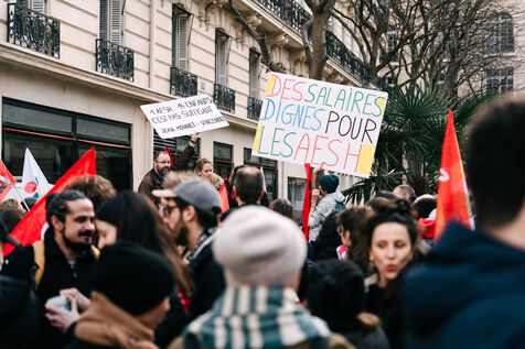 Les Accompagnant des élèves en situation de handicap (AESH) ont manifesté à proximité du ministère de l'Éducation nationale afin de réclamer de meilleurs de conditions de travail. Ce rassemblement fait suite à un rejet de proposition de loi du Sénat pour ouvrir un statut de fonctionnaire de catégorie B aux AESH.