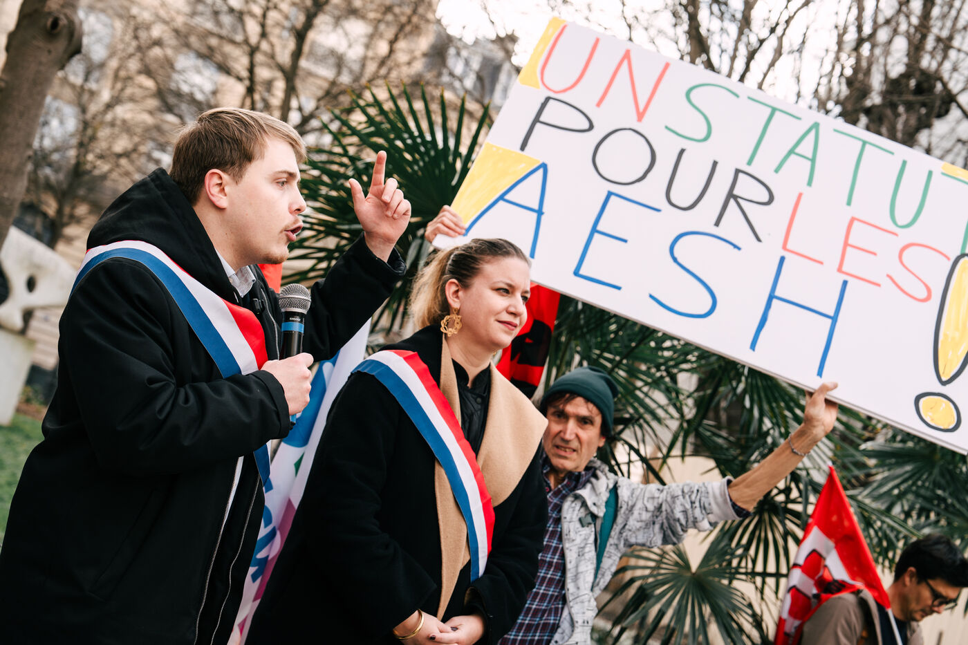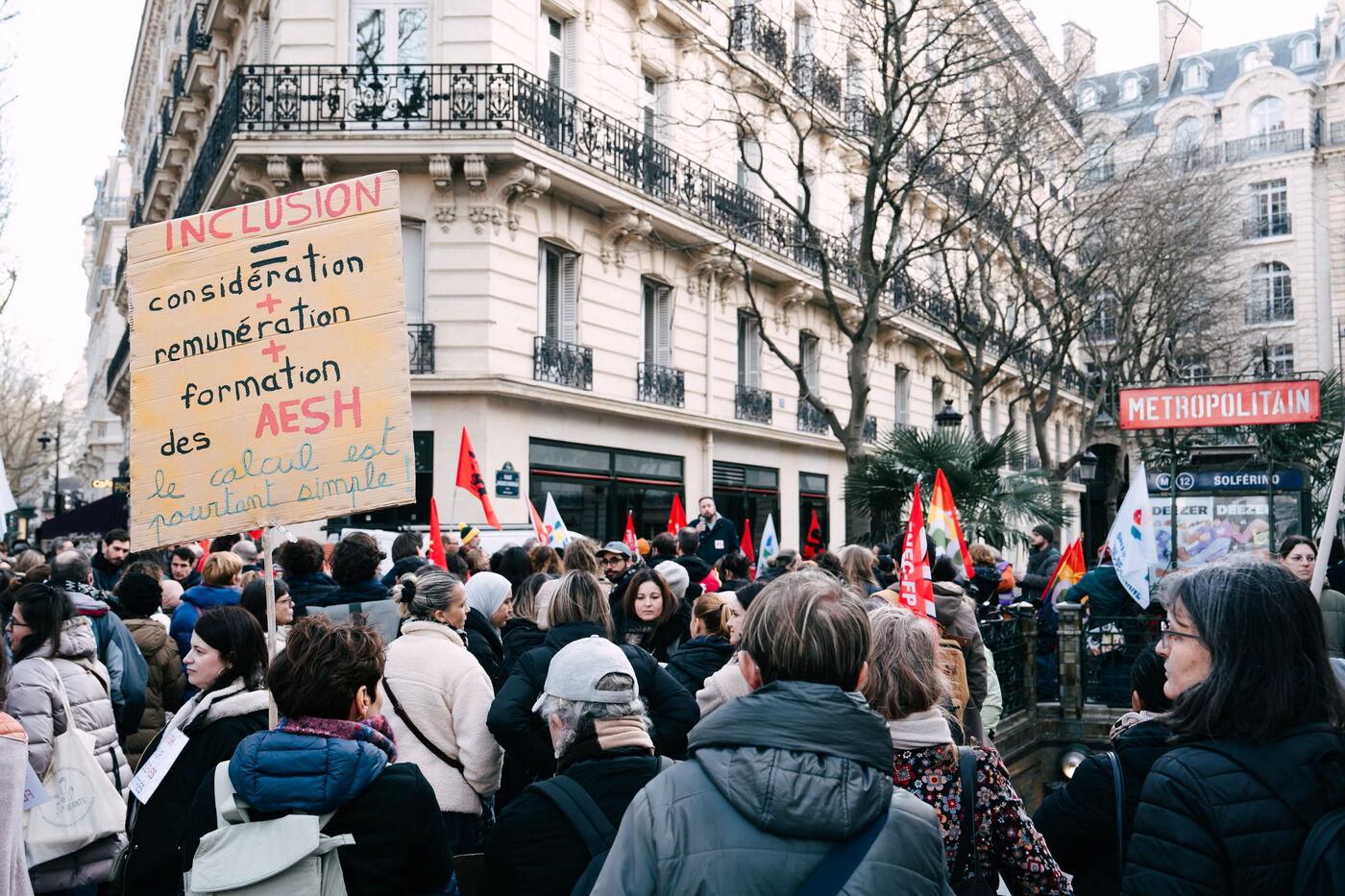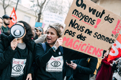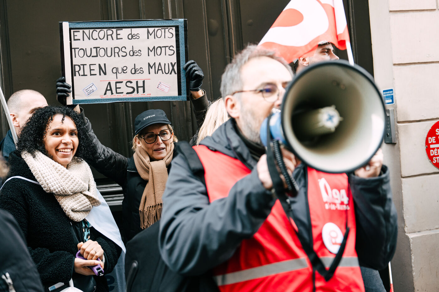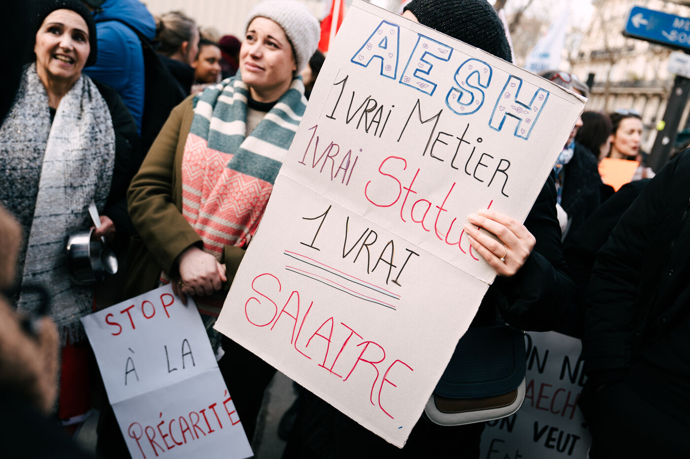 Les Accompagnant des élèves en situation de handicap (AESH) ont manifesté à proximité du ministère de l'Éducation nationale afin de réclamer de meilleurs de conditions de travail. Ce rassemblement fait suite à un rejet de proposition de loi du Sénat pour ouvrir un statut de fonctionnaire de catégorie B aux AESH.