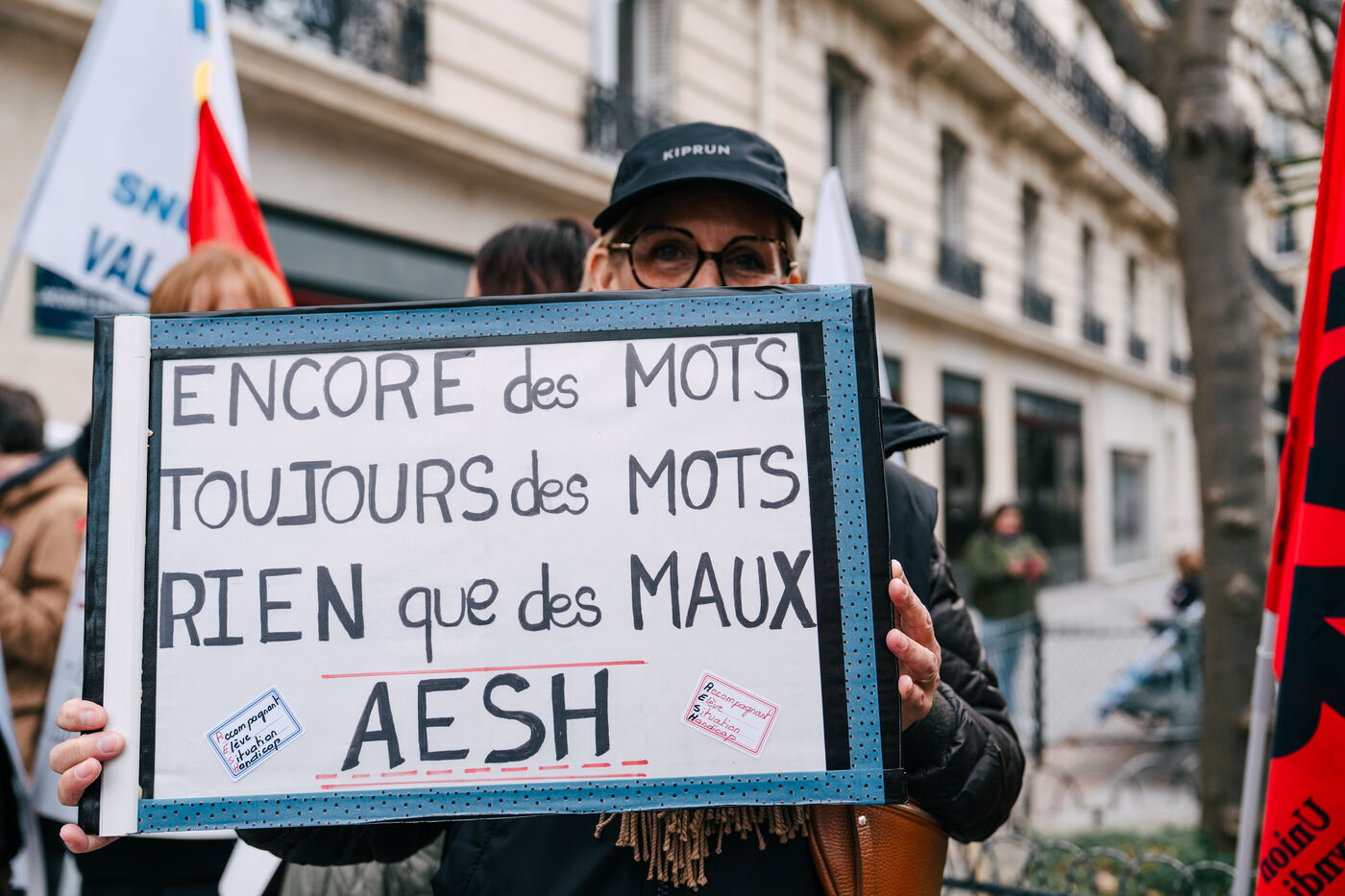 Teaching assistants for students with disabilities (AESH) demonstrated near the Ministry of National Education to demand better working conditions. This gathering follows the Senate's rejection of a bill that would have granted AESH civil servant status (category B).