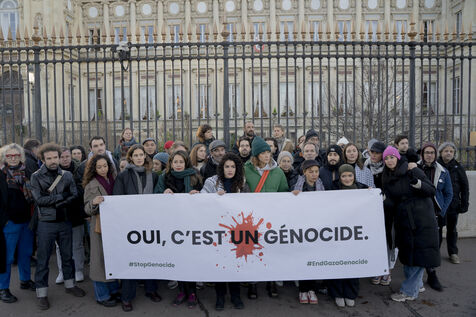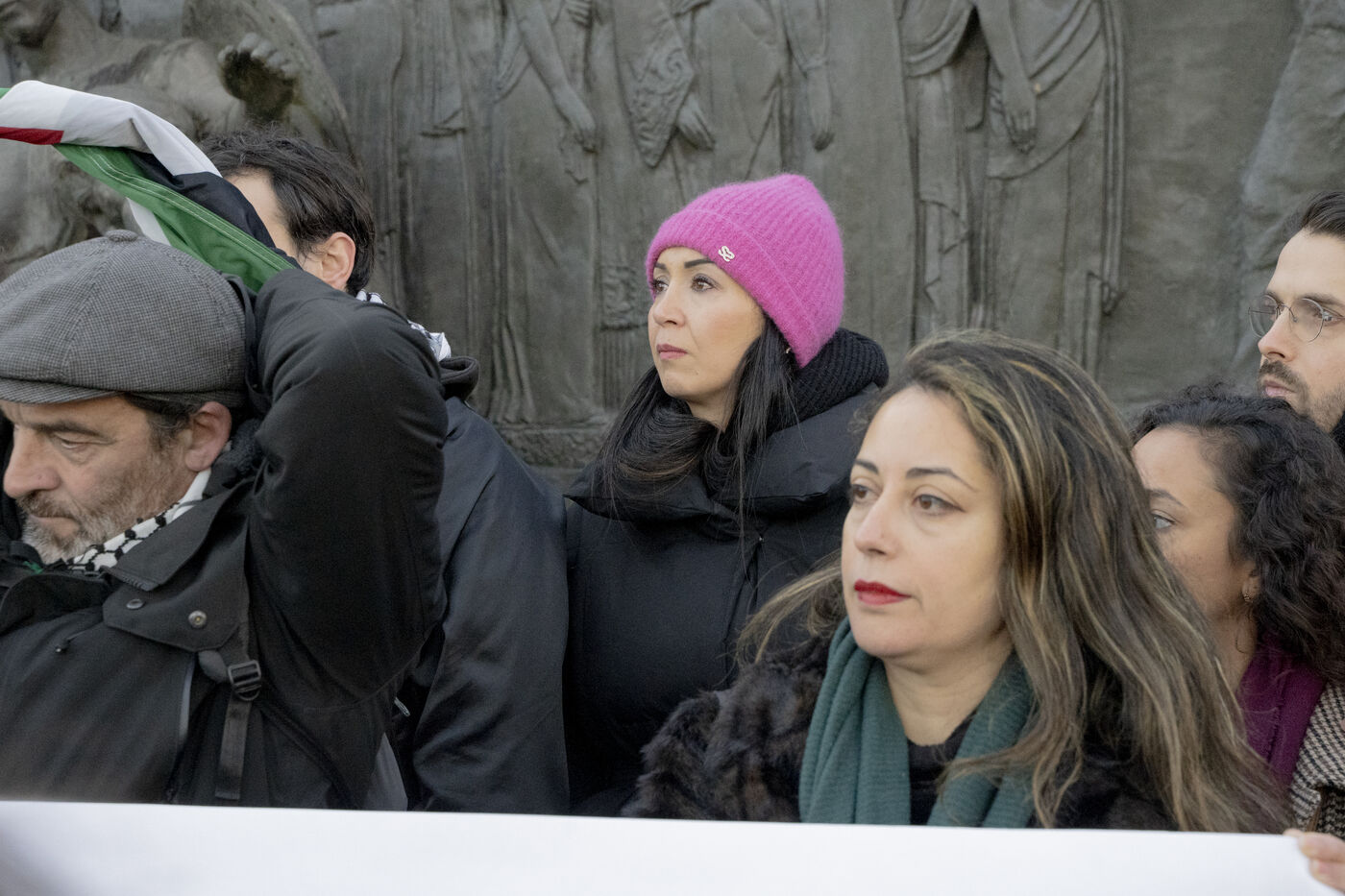 Paris, France. 2024-12-20 - Le collectif "Artiste pour la Palestine France" s'est réunit devant le Quai d'Orsay devant l'Hôtel d'du ministre des Affaires étrangères. Ils dénoncent le "génocide en cours" à Gaza et appellent le milieu culturel à s'engager.