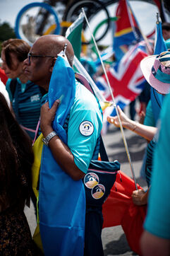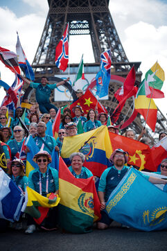 Tour Eiffel - Paris - France, rassemblement des volontaires pour un grand défilé aux couleurs olympiques un an après la cérémonie d’ouverture des JO 2024.