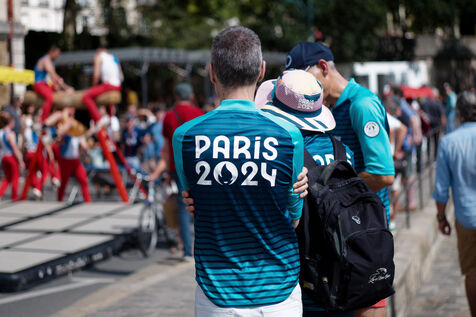 Tour Eiffel - Paris - France, volunteers gather for a grand parade in Olympic colours one year after the opening ceremony of the 2024 Olympic Games.