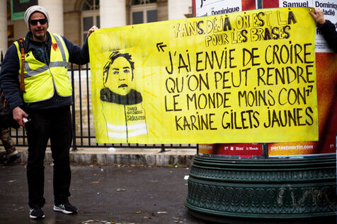 Paris - France : demonstration to celebrate the seventh anniversary of the yellow vest movement at Place de la Bourse in Paris. Since its inception, the movement has been calling for greater social justice and participatory democracy.