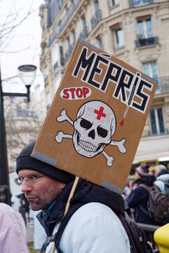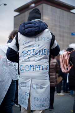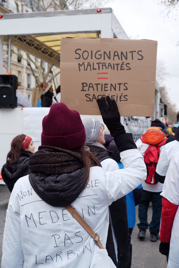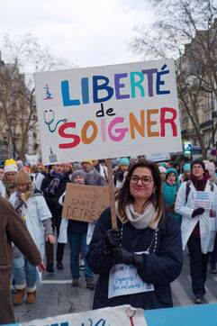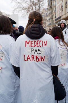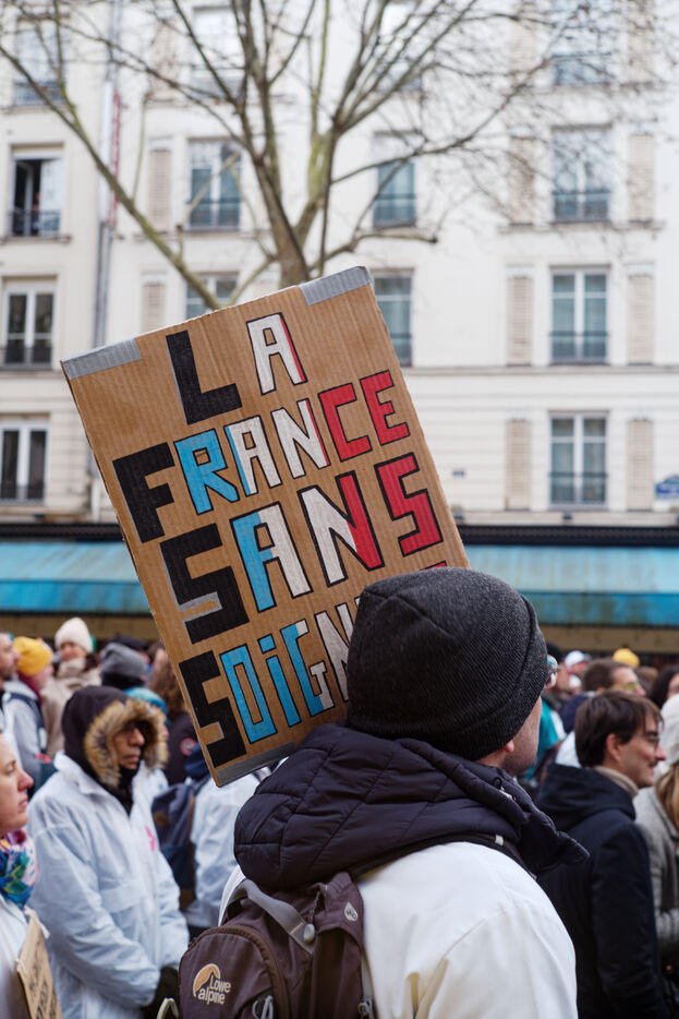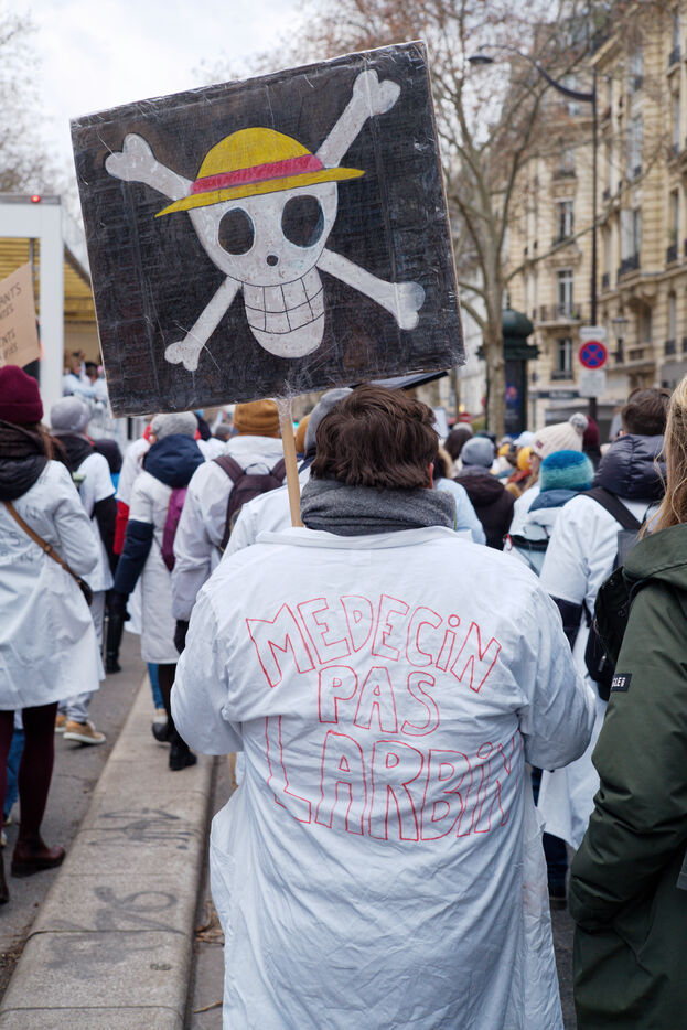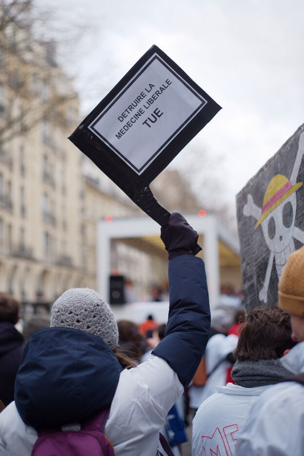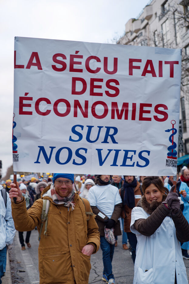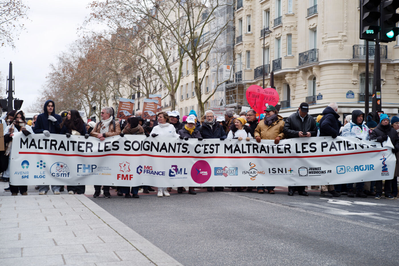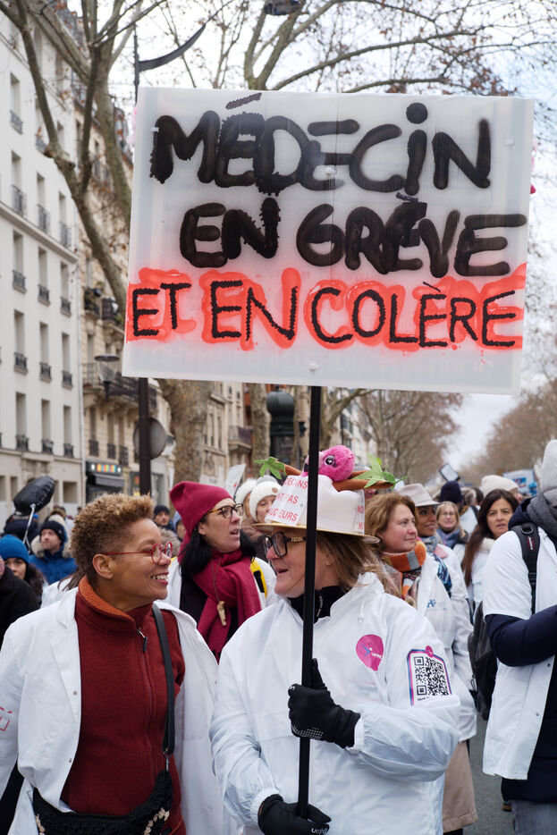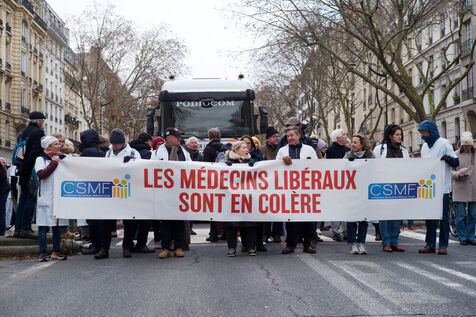 Paris, France: Demonstration by private doctors against the Social Security Financing Bill on Boulevard du Montparnasse in the city of Paris on January 10, 2026. Medical unions denounce an authoritarian drift in the healthcare system and the 2026 social security budget bill proposed by Minister Stephanie Rist.