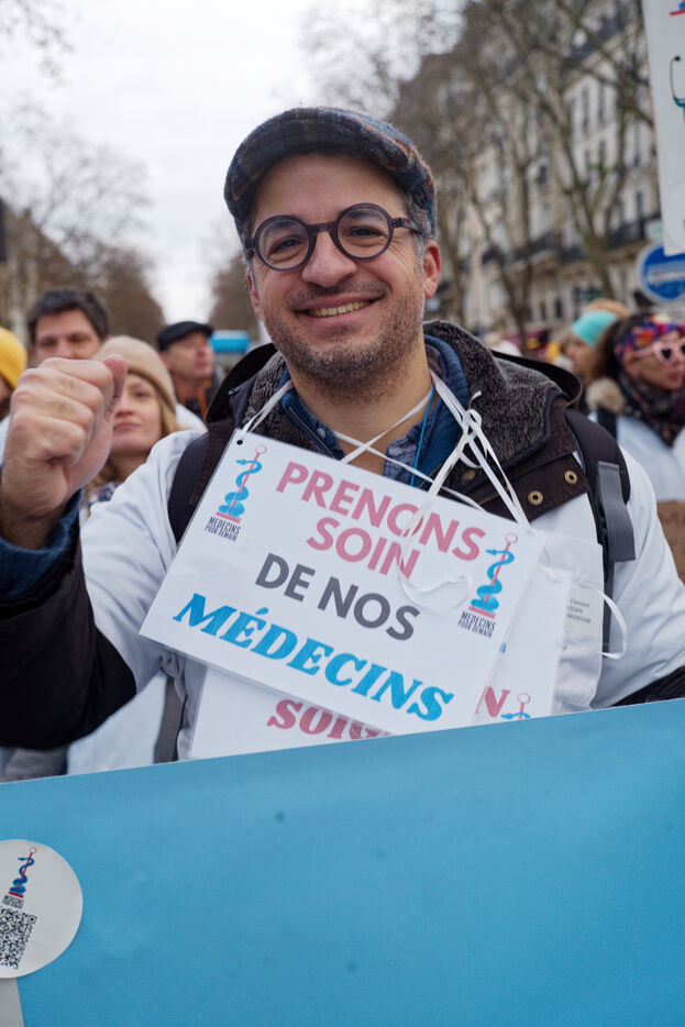 Paris - France : manifestation des médecins libéraux contre le PLFSS boulevard du Montparnasse dans la ville de Paris le 10 janvier 2026. Les syndicats médicaux dénoncent une derive autoritaire du système de santé et du projet de budget de la sécurité sociale 2026 porte par la ministre Stephanie Rist.
