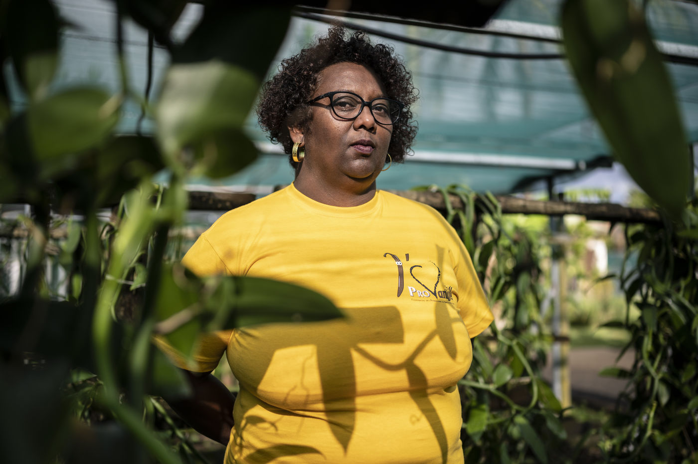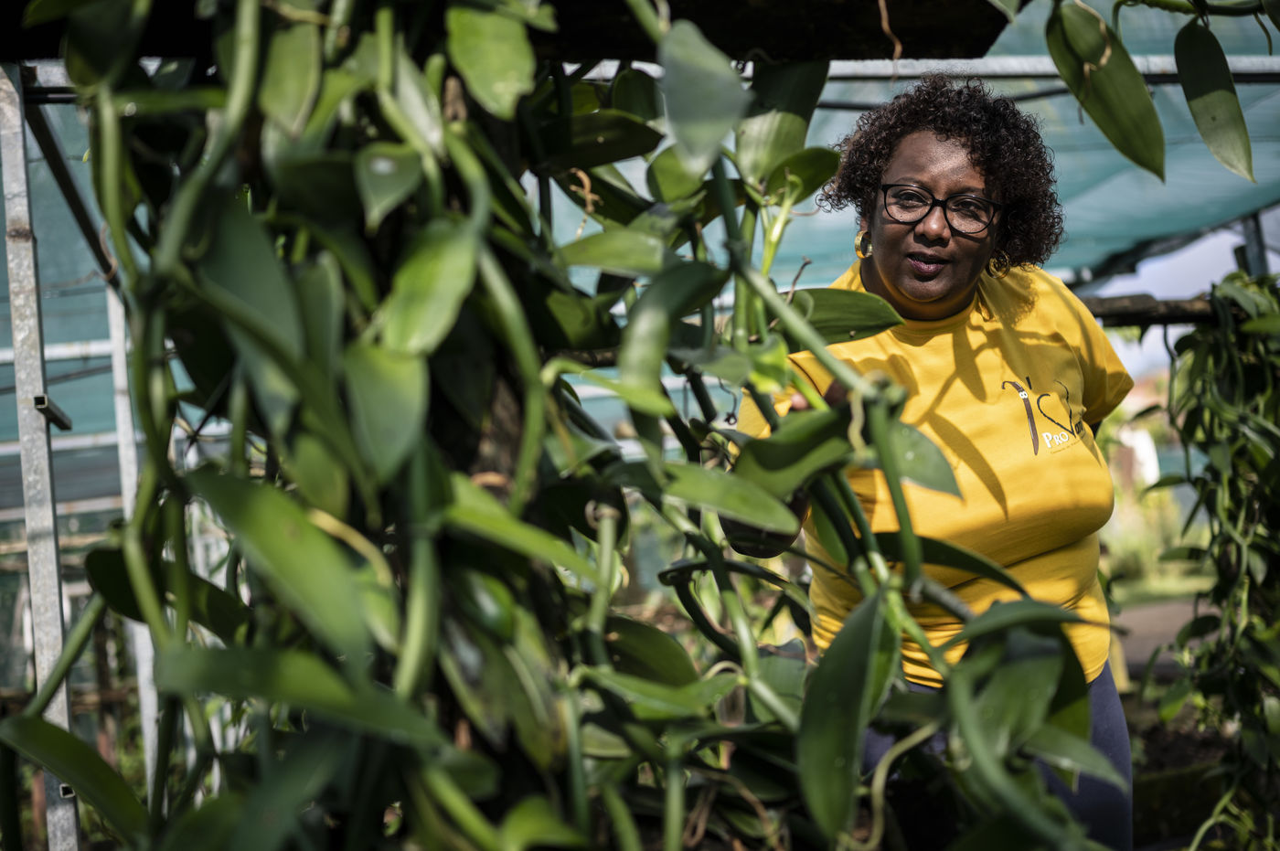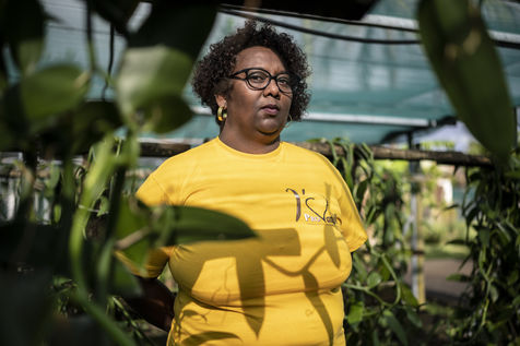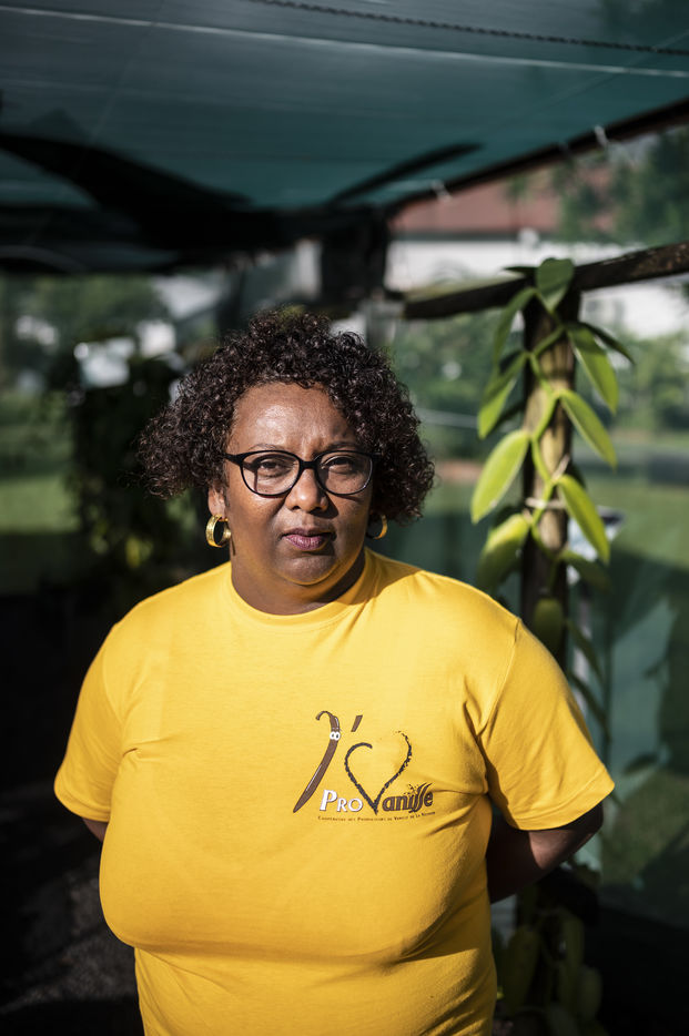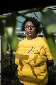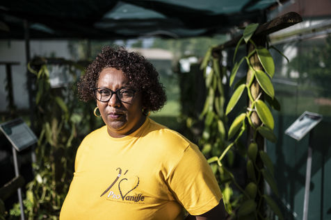 Portrait of Fabiola Chrysot, a specialised agricultural technician at ProVanille, the historic cooperative on Reunion Island that brings together more than a hundred producers, in front of a vanilla vine.