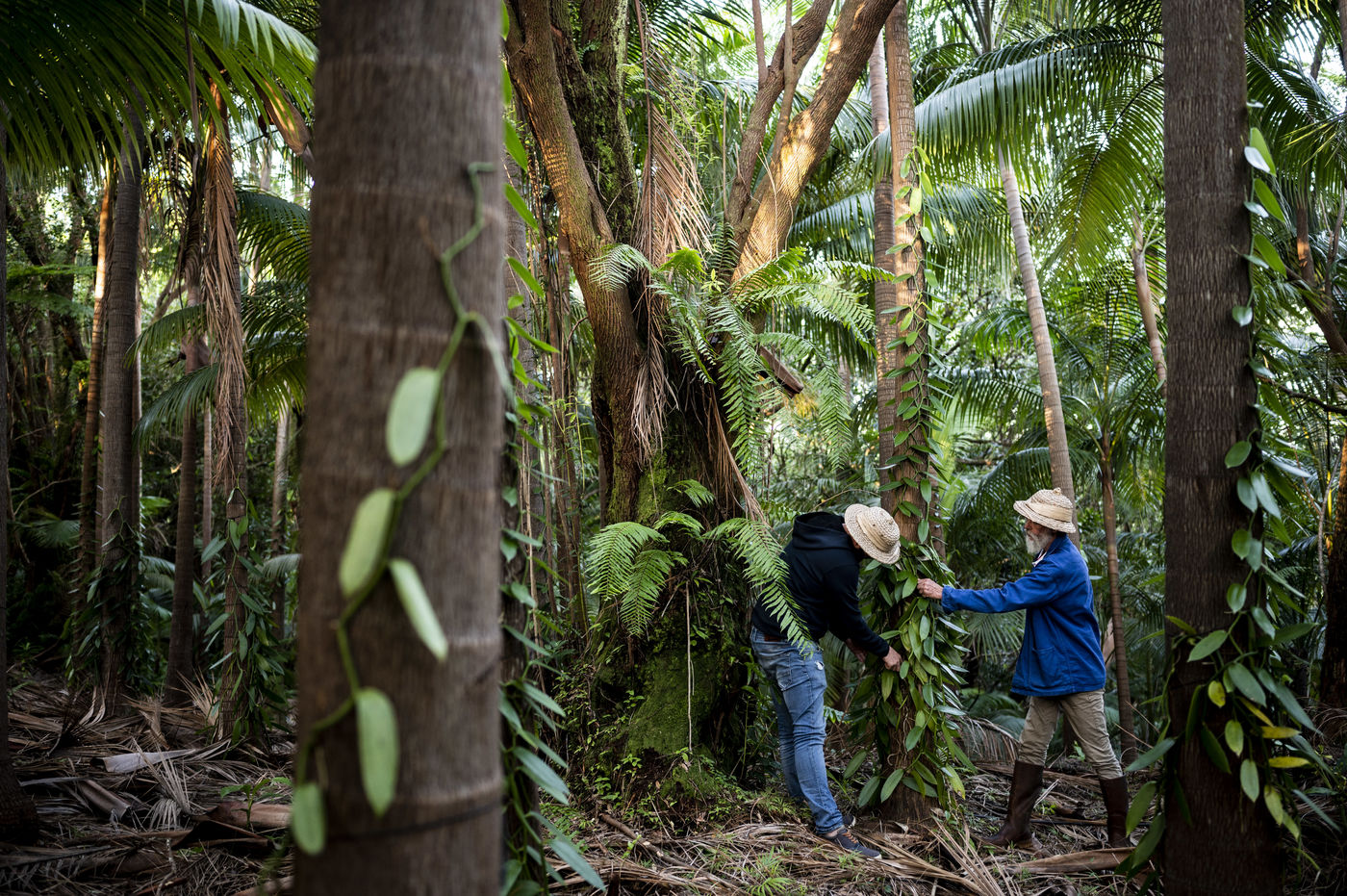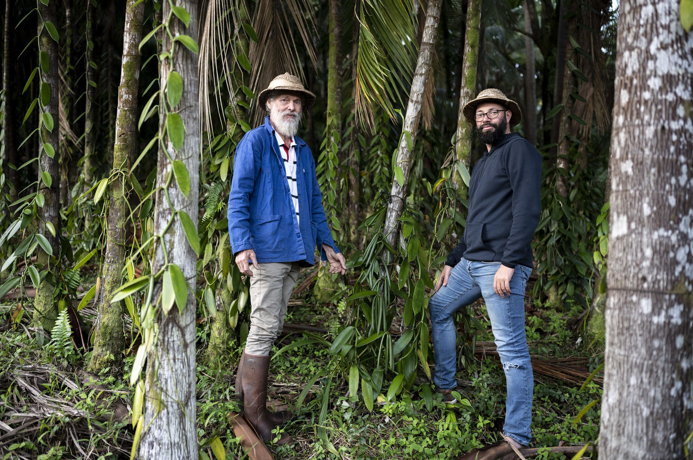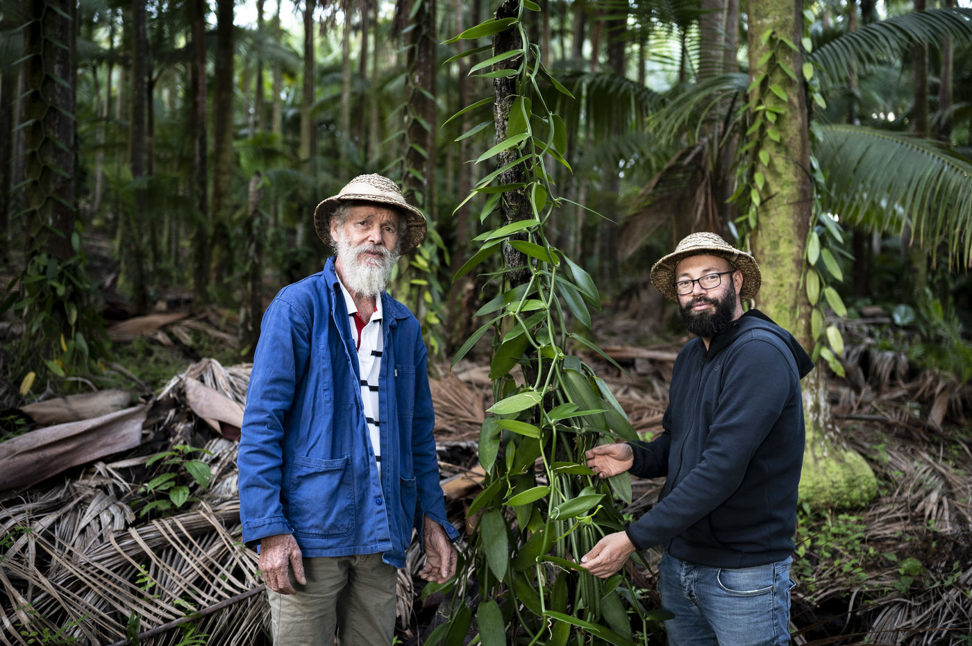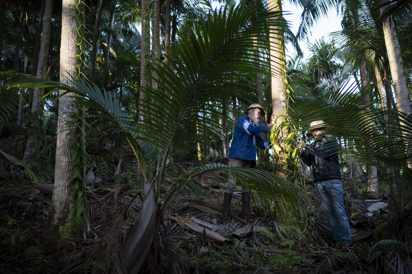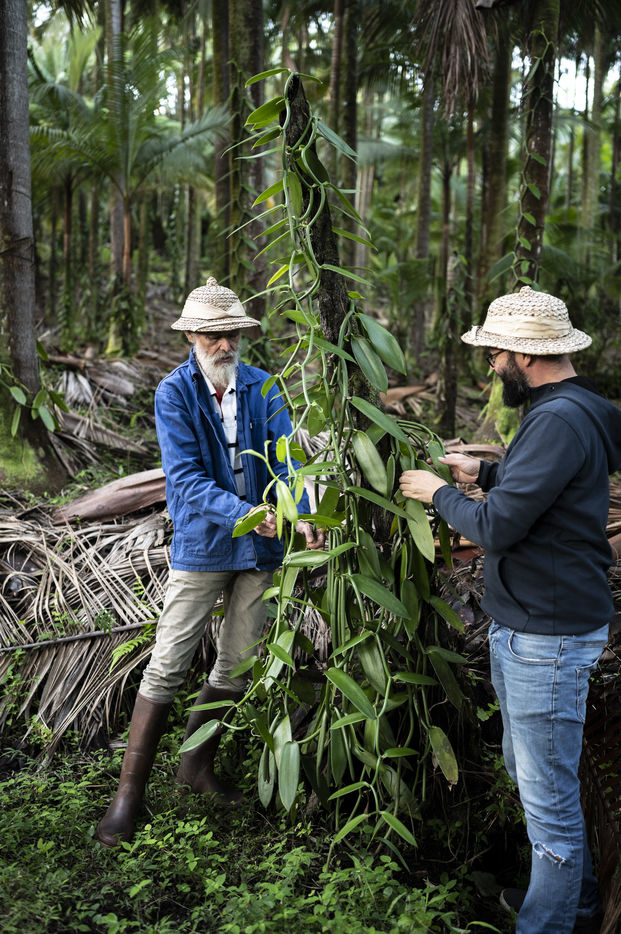 Louis Leichnig and his son Geoffrey looking at their vanilla trees in their field under the palm trees on the slopes of the Piton de la Fournaise. ILLUSTRATION ONLY OF ARTICLES CONCERNING THE HOUSE LOUIS LEICHNIG.