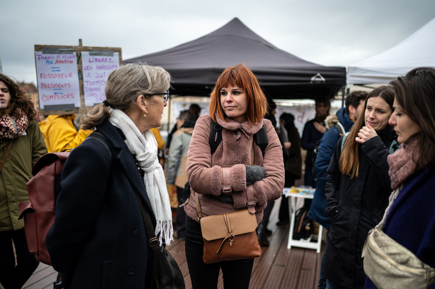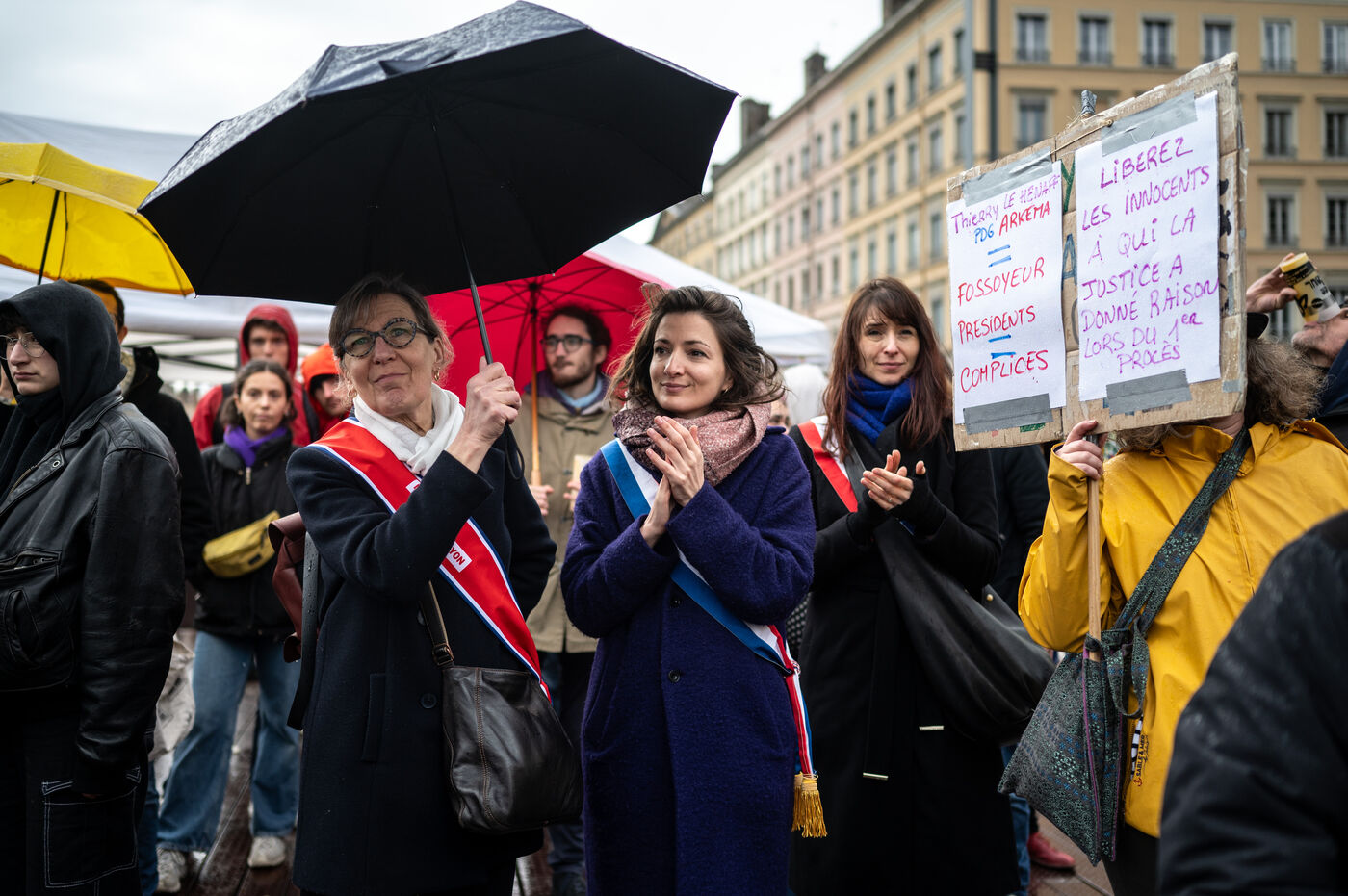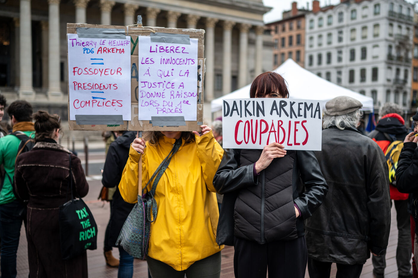 Festive demonstration before the appeal trial of the eight environmental activists from the Extinction Rebellion movement on trial for a civil disobedience action on 2 March 2024 at the Arkema chemical platform in Pierre-Bénite.