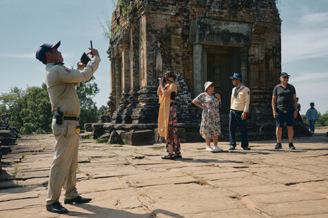 Dozens of groups accompanied by guides, arriving by bus or tuk-tuk, the local means of transportation, are preparing to enter the residence of King Suryavarman II to explore the remains of a Khmer heritage site classified as a UNESCO World Heritage Site along with its population.