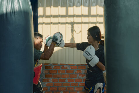 The sound of punching bags echoes at a frantic pace in an open-air gym a few dozen kilometers from Phnom Penh. It's warm-up time. Vanda, Souannita, and Dalin, three young women, train every day under the guidance of Vanda's father, a referee of Kun Khmer, Cambodian boxing. He first trained his daughter, Vanda, then the village children came. There is no comfort here: the rooms are made of sheet metal, and the lessons are free.
